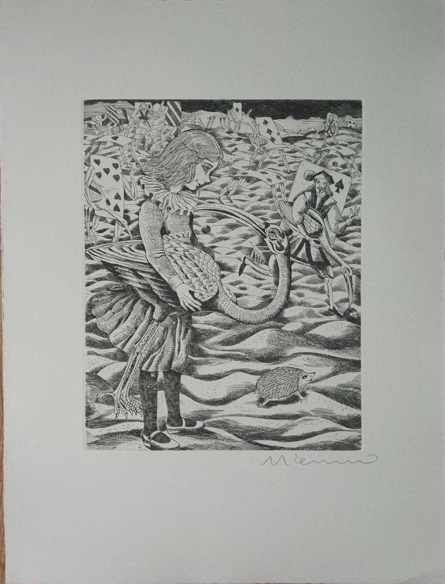 Superbe gravure originale signée au crayon par l'artiste. Pointe sèche pour Alice au pays des merveilles de Lewis Carroll.