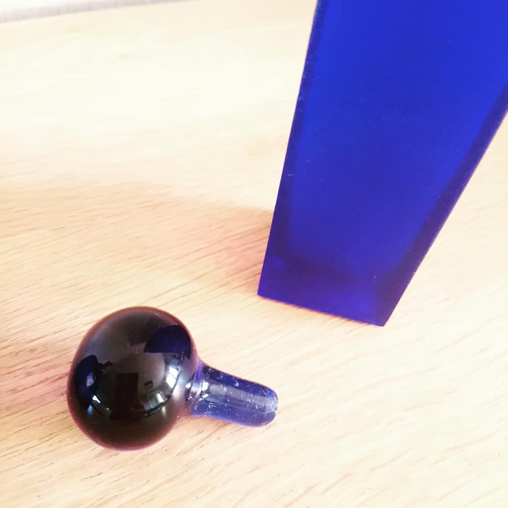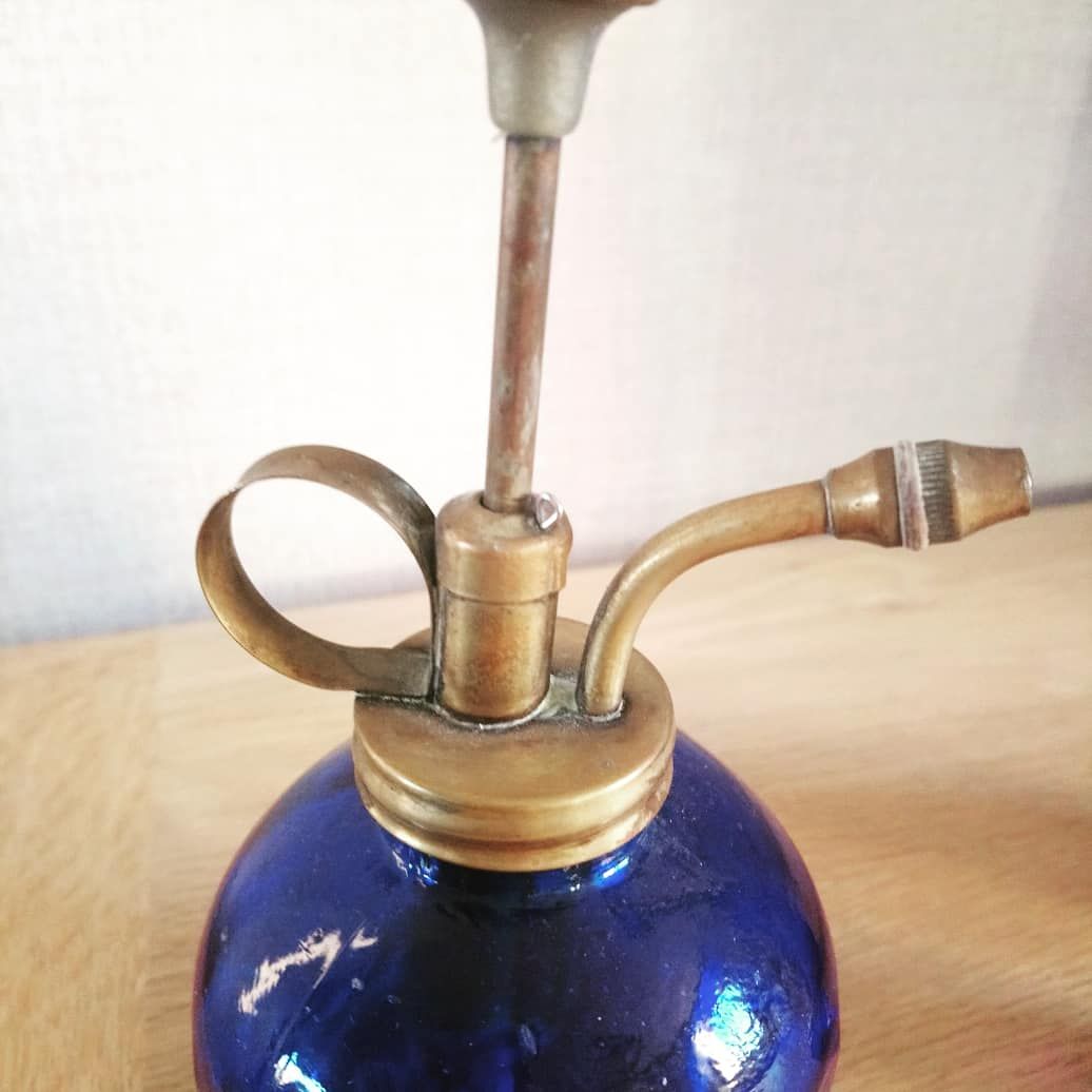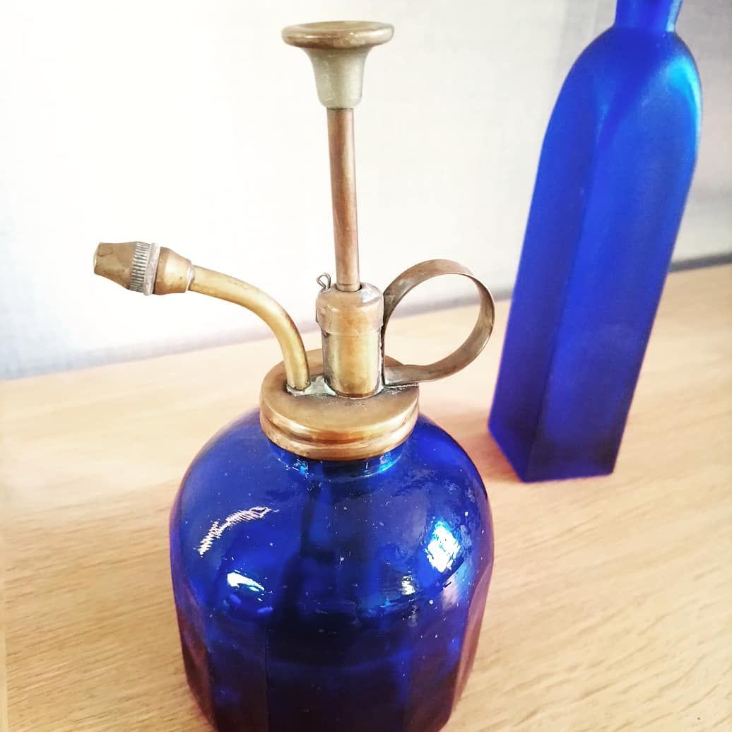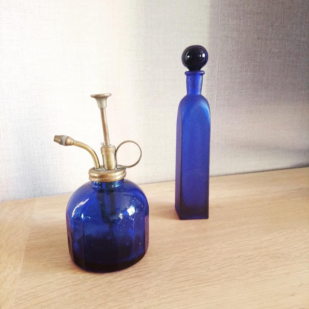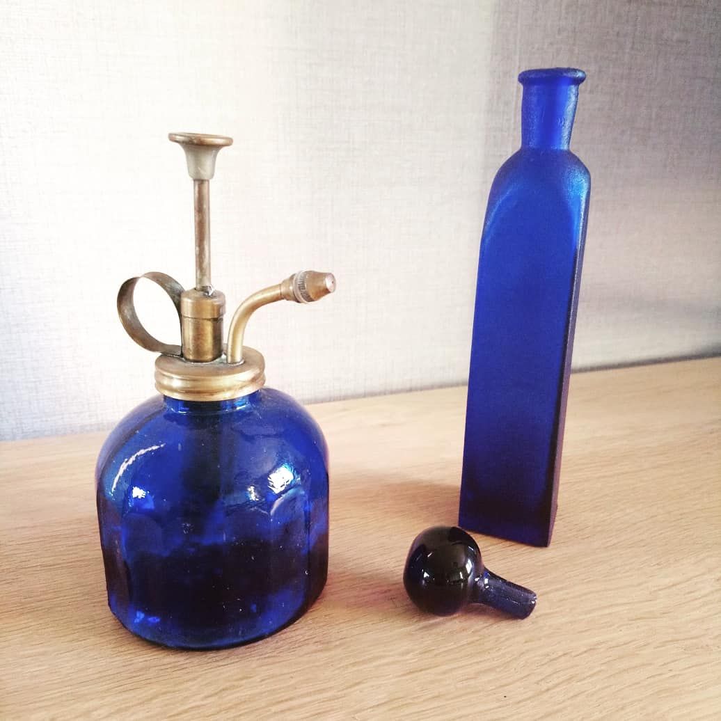 Joli ensemble de bouteilles de parfum bleu. Il se compose d un vaporisateur vintage, ou burette en verre, piston en laiton, et de son flacon de parfum.