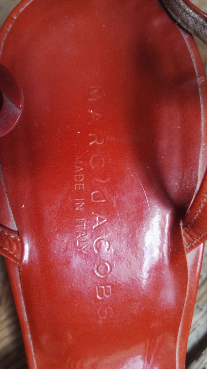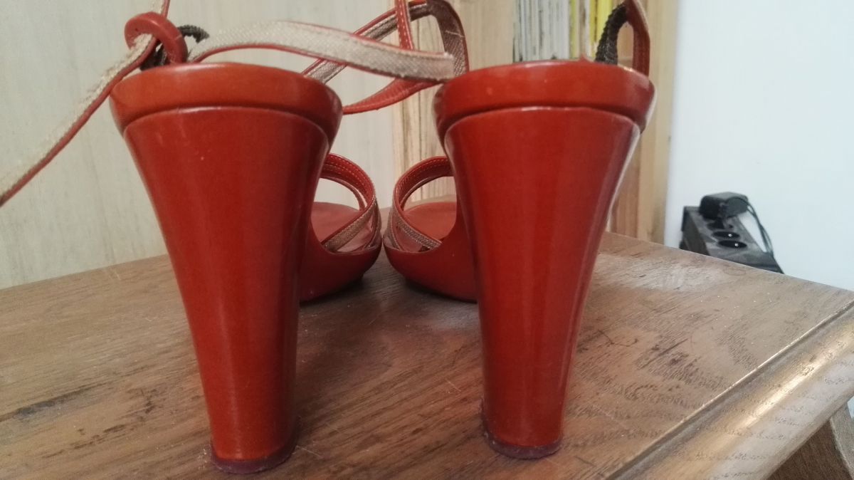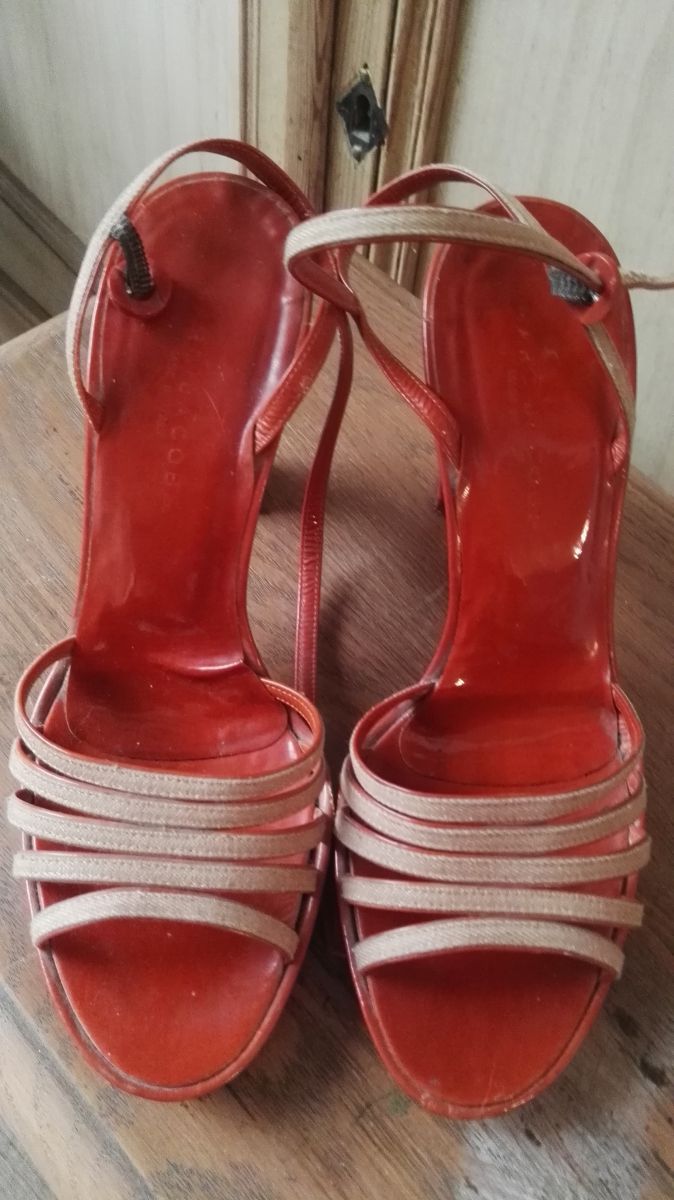 Sandales vintage (2000) en cuir verni orange flamme et toile écrue Marc Jacobs, talons 9 cm et plate-forme 1,5 cm.