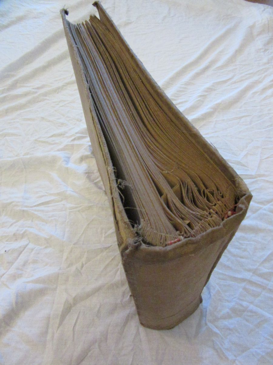 Couverture effilochée et ternie, pages grisâtres parfois tachées.