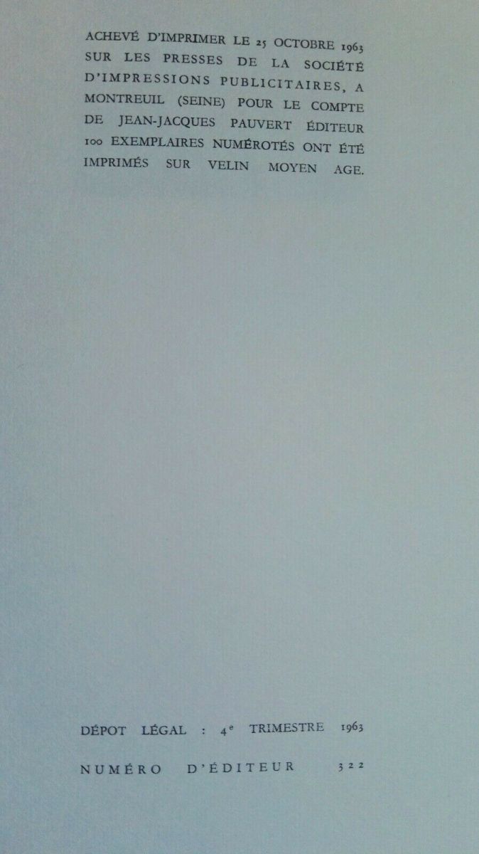 Édt Jean-JacquesPauvert, Paris, 1963. Couverture rigide. Très bon état
