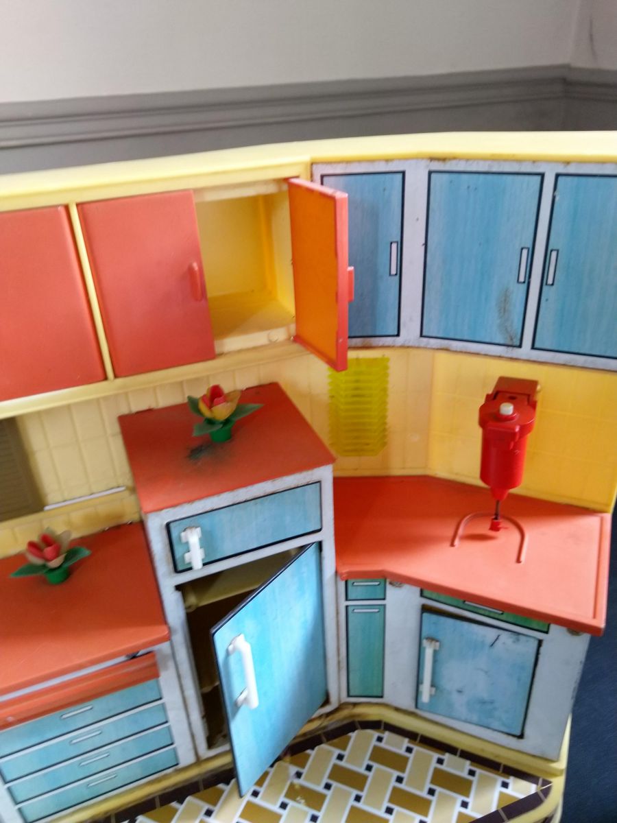 La Super Cocina , cuisine de poupée en tole et plastique. Mesure environ 63 cm de largeur sur 35 cm de hauteur, taille adaptée pour une poupée mannequin classique. Les volets et plusieurs portes s'ouvrent, d'autres sont décoratives.