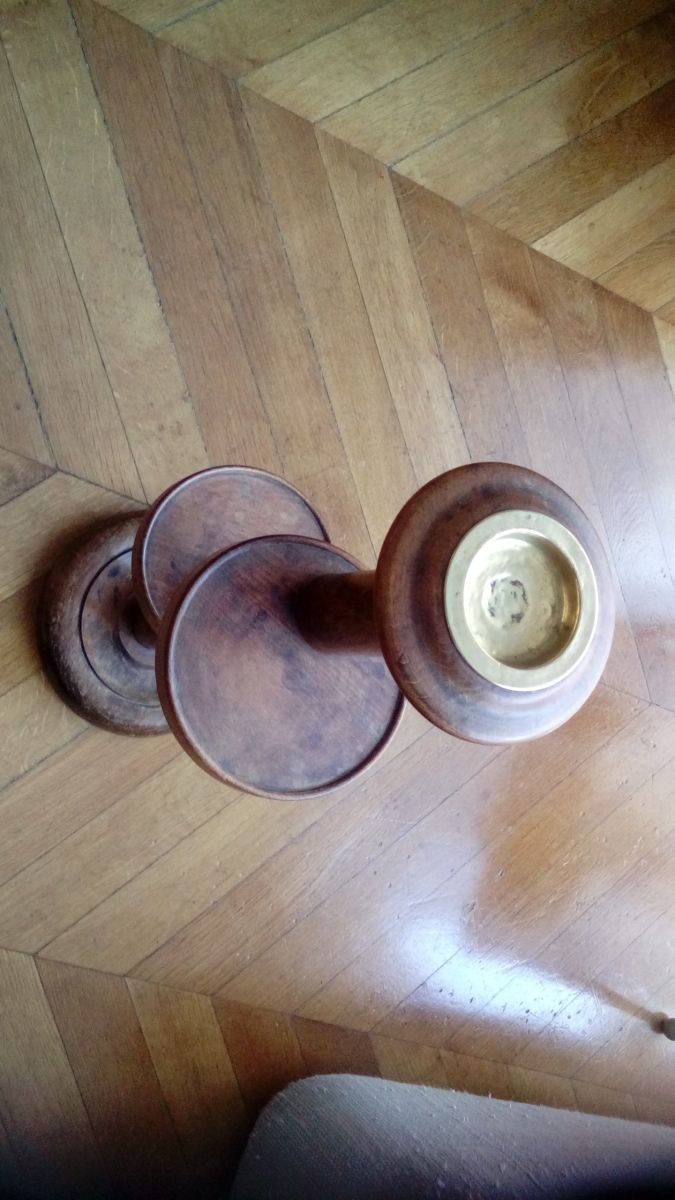 Hauteur 62 cm et diamètre des plateaux 16 cm.