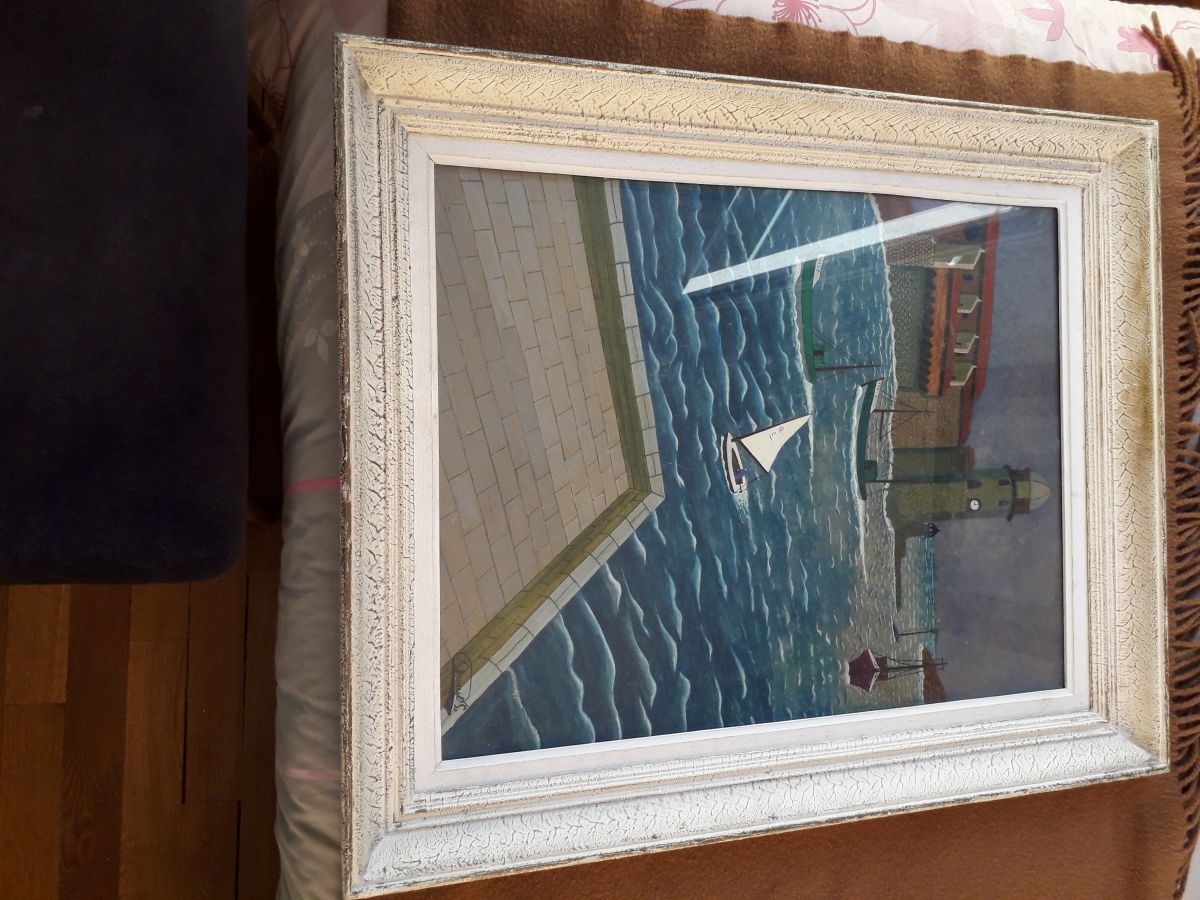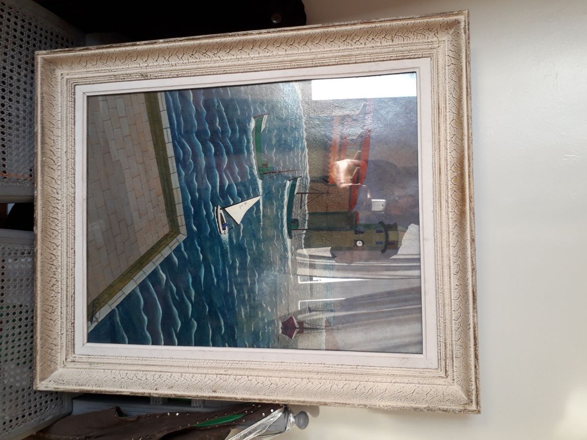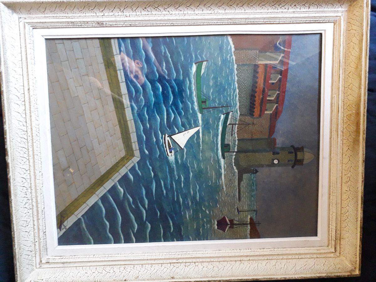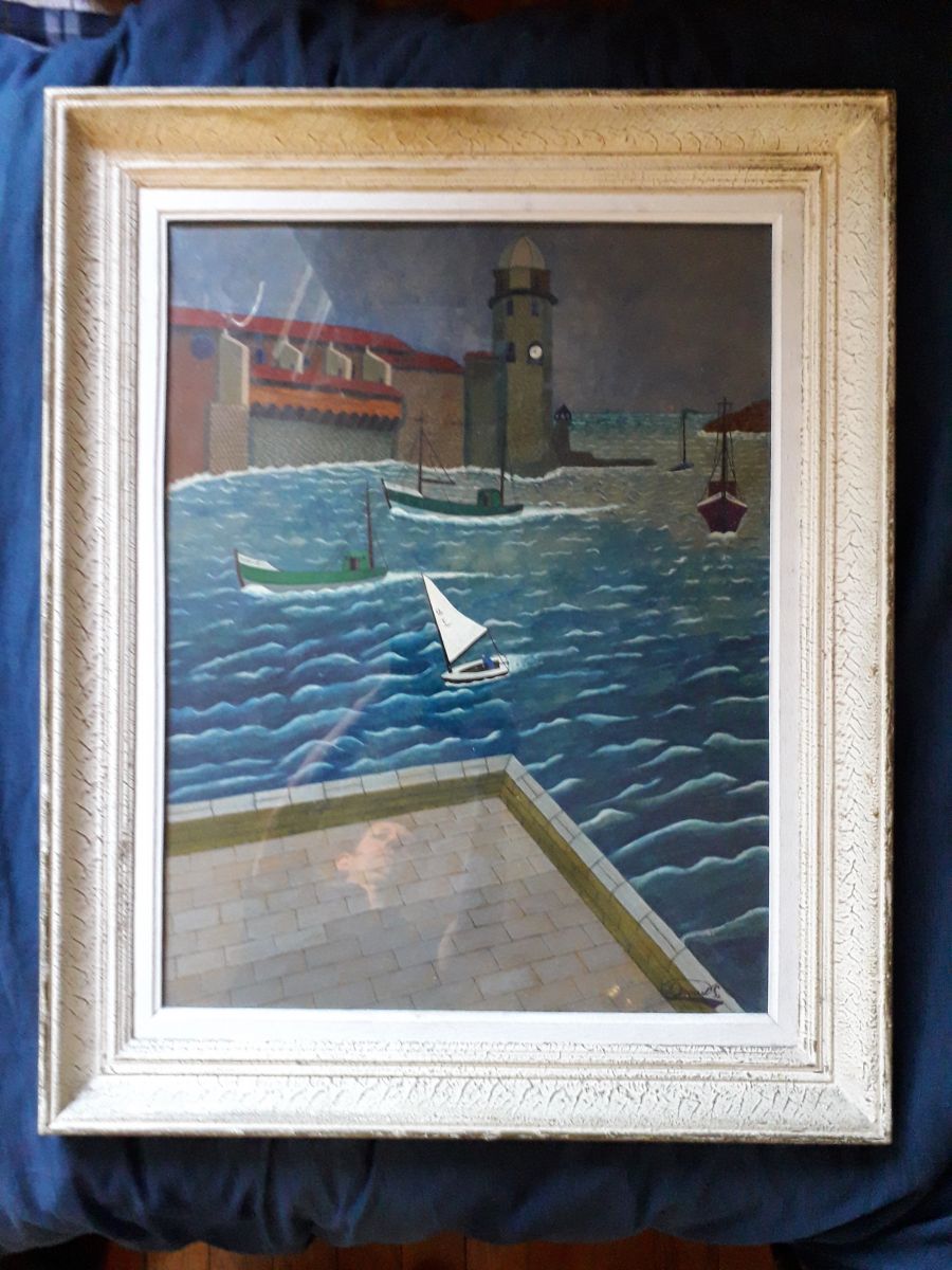 Peinture signée et encadrée représentant un paysage de mer avec un port de pêcheurs.
