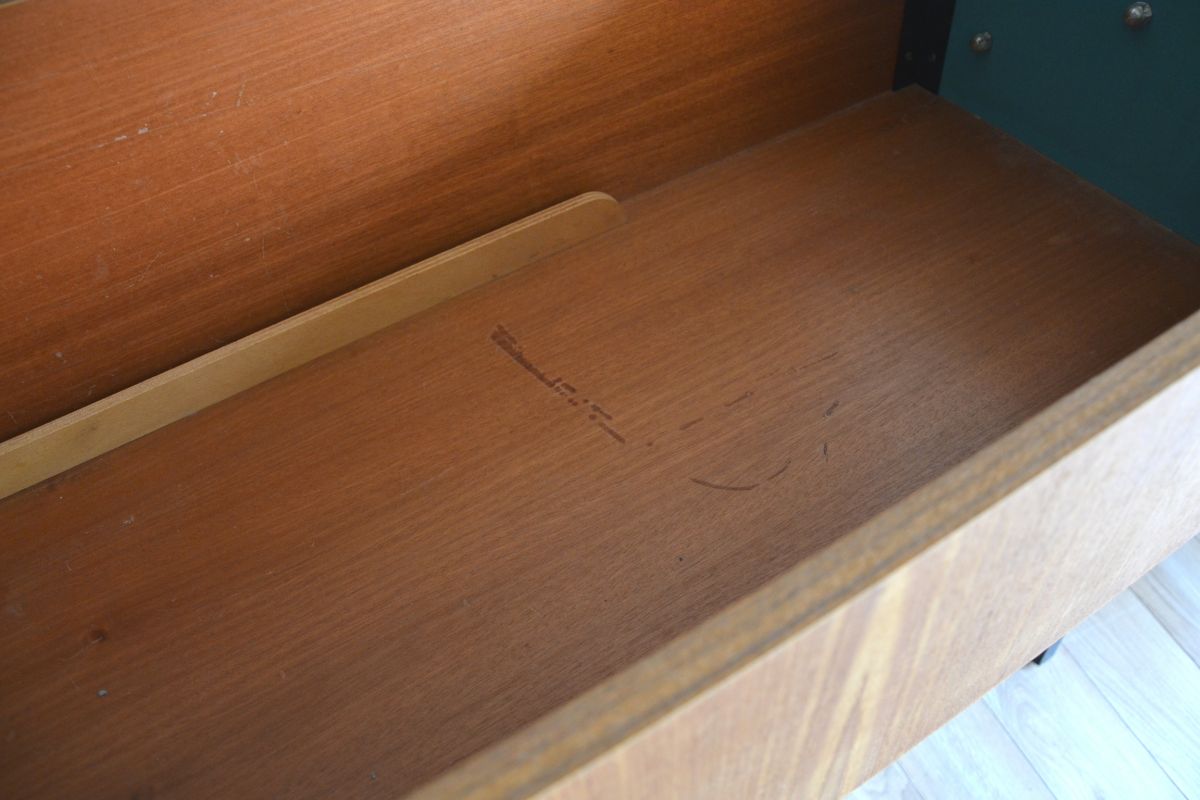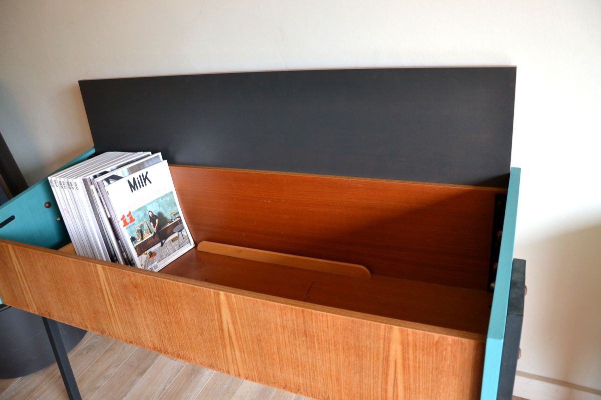 Ancien meuble tricoteuse revisité en gris graphite vernis et côté en bleu turquoise, Idéal en console, rangement vinyles ou magazines. Les pieds en métal carré, le coffre en bois plaqué. Le plateau amovible pour profiter du rangement. Quelques traces à l'intérieur sans gravité.
