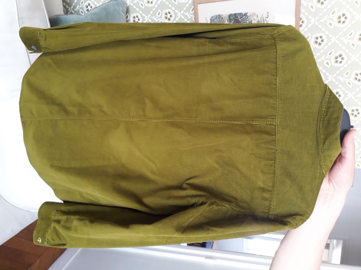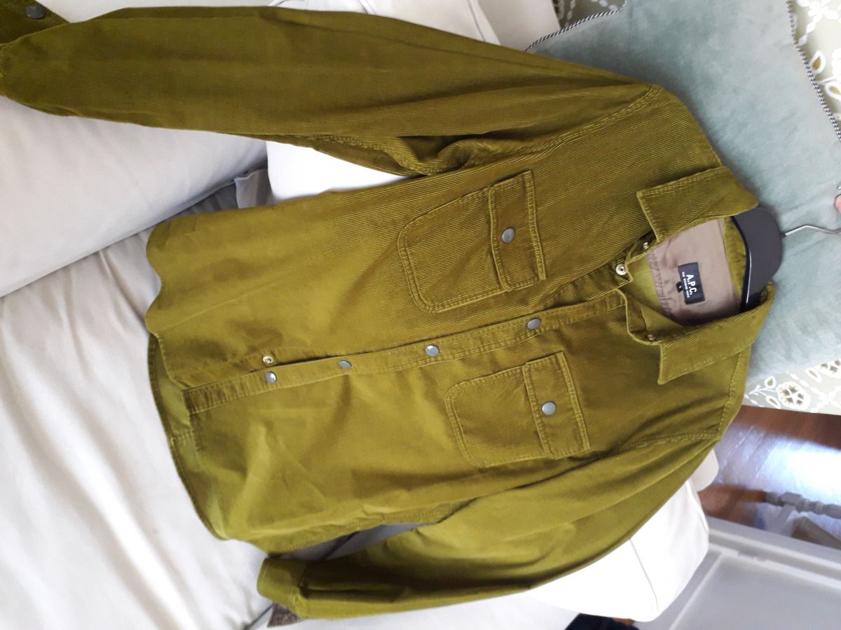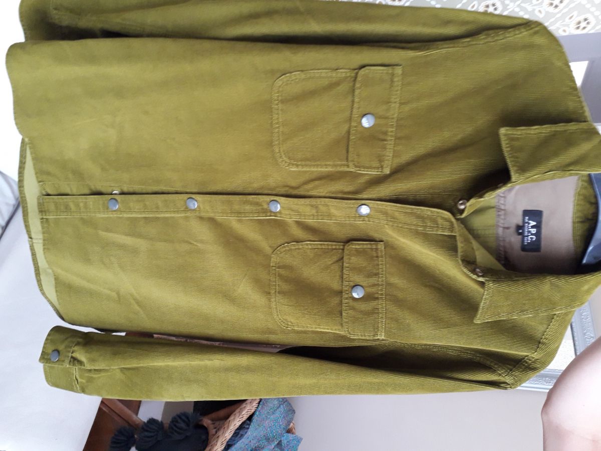 Chemise APC en velours vert (taille S) avec 2 poches poitrine. Les fermetures sont à pression.