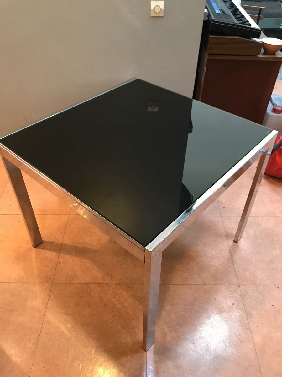 Vente d'une table en verre fumé Calligaris 90X90 (extensible jusqu'à 150 cm).