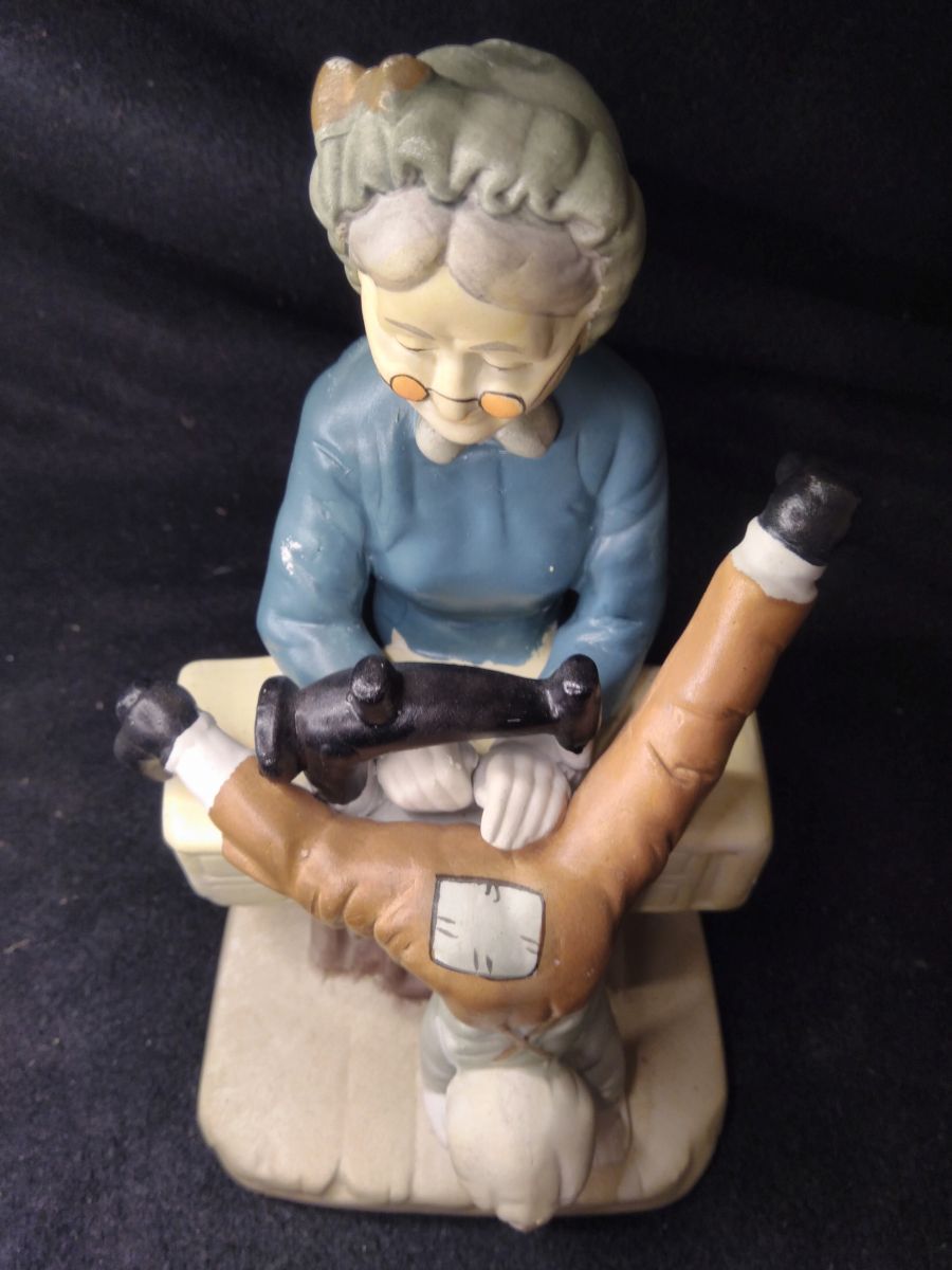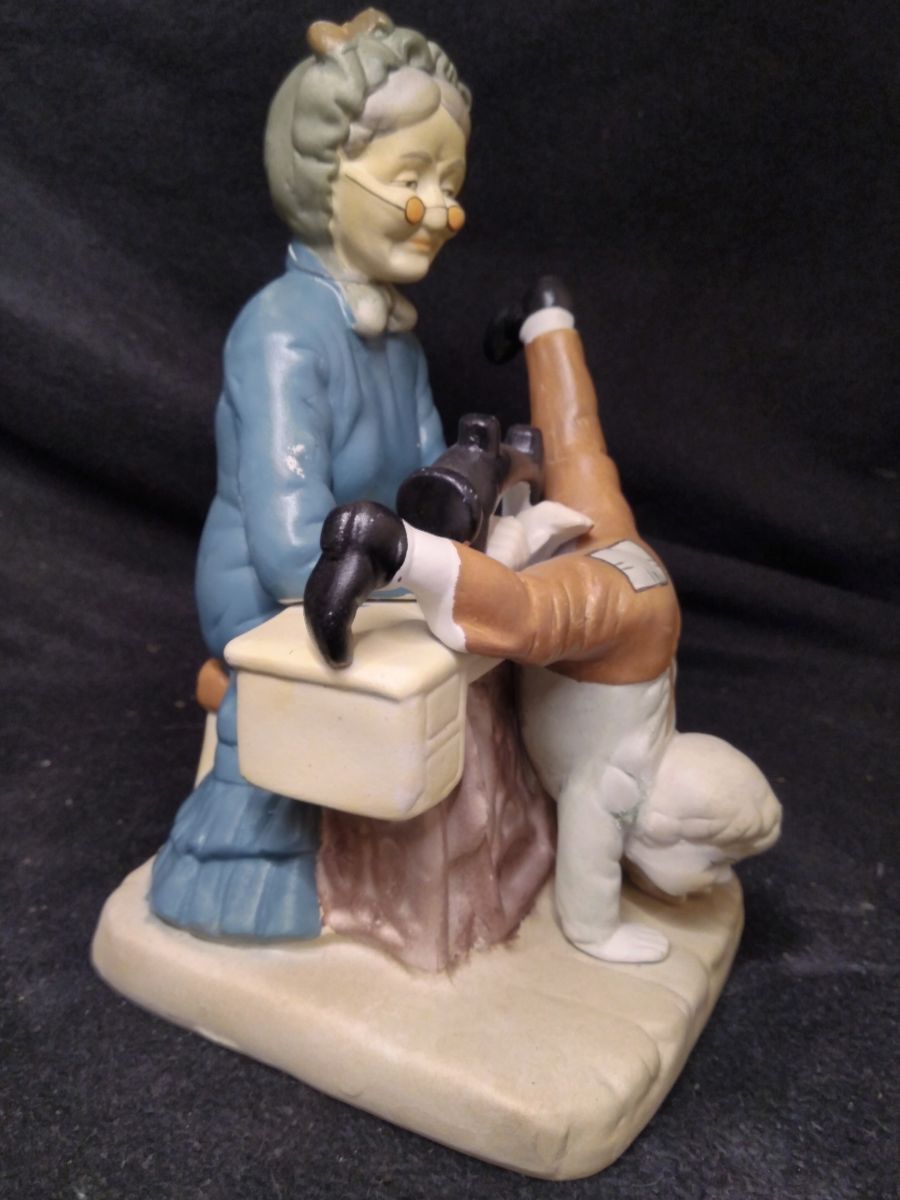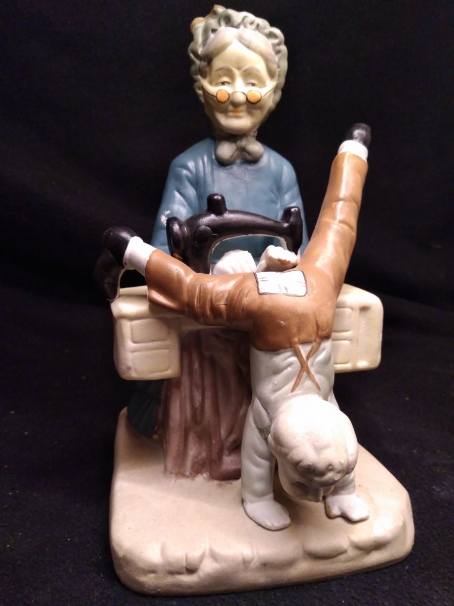 Belle figurine ancienne en biscuit de porcelaine représentant une grand-mère raccommodant le pantalon d'un petit garçon.