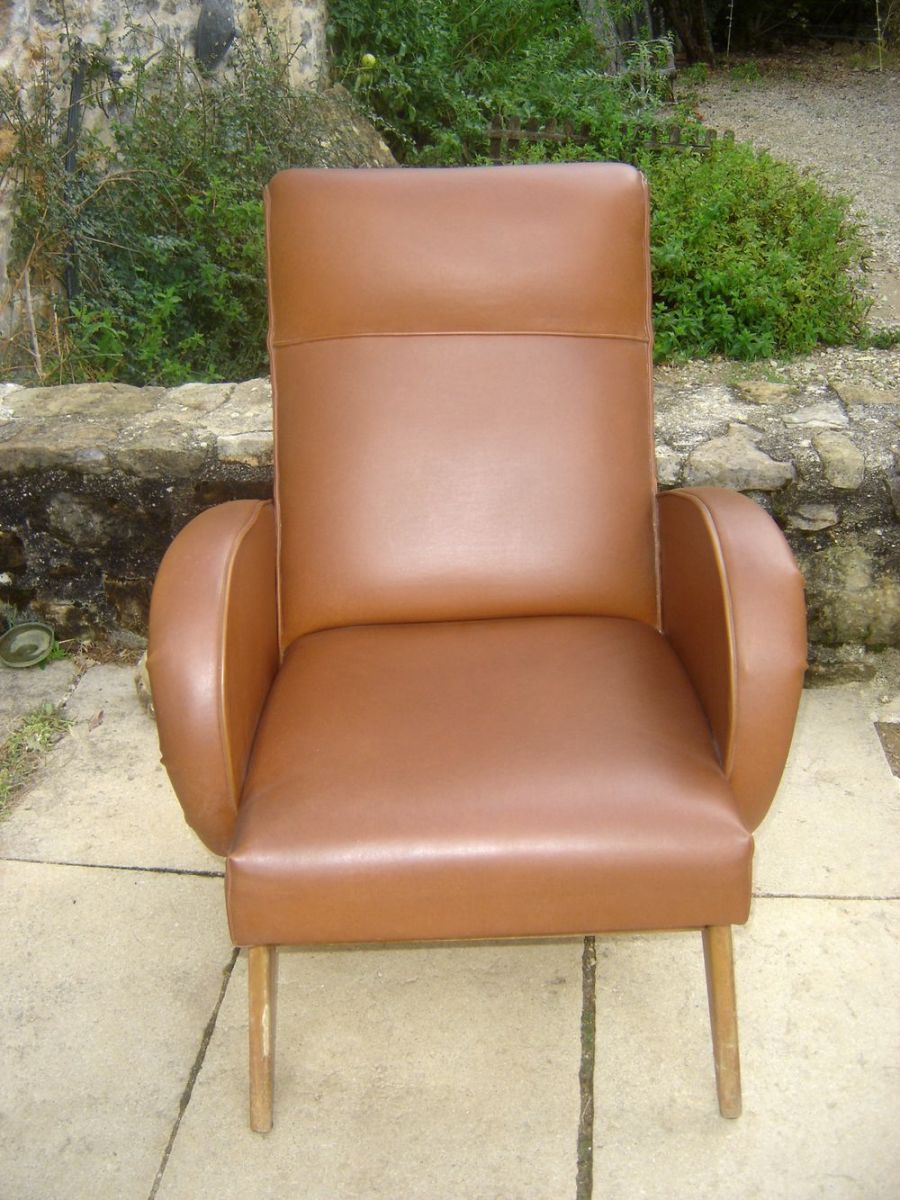 Fauteuil des années 50-60 dans son jus. Pas d'accroc, en skaï fauve. Bonne assise. Très bon état vu son âge mais à besoin d'être nettoyer.