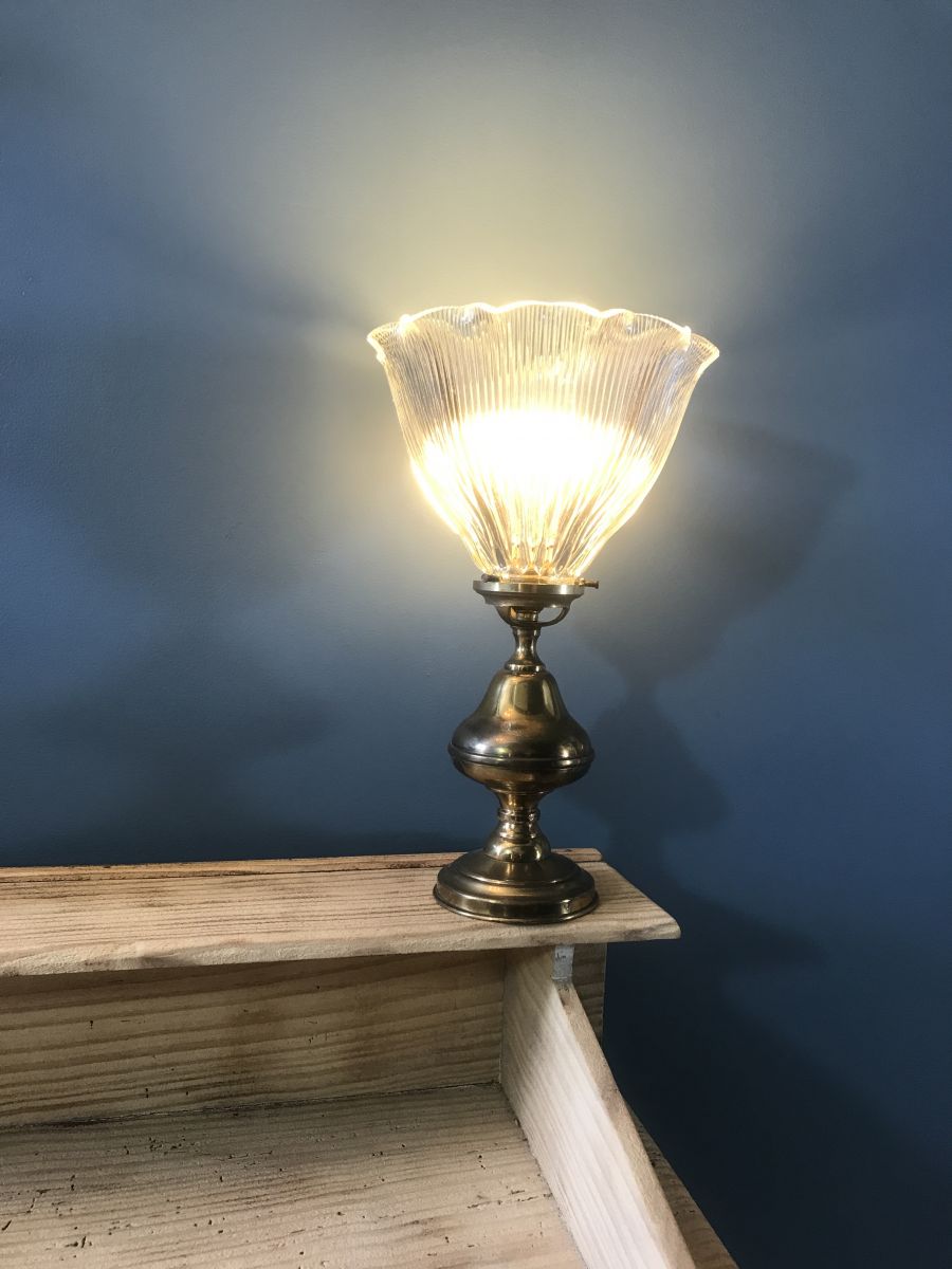 Bel état vintage. Le doré est passé, juste comme il faut pour lui donner du charme , la tulipe en verre est impeccable. Le fil électrique , la prise et l’interrupteur sont neufs.