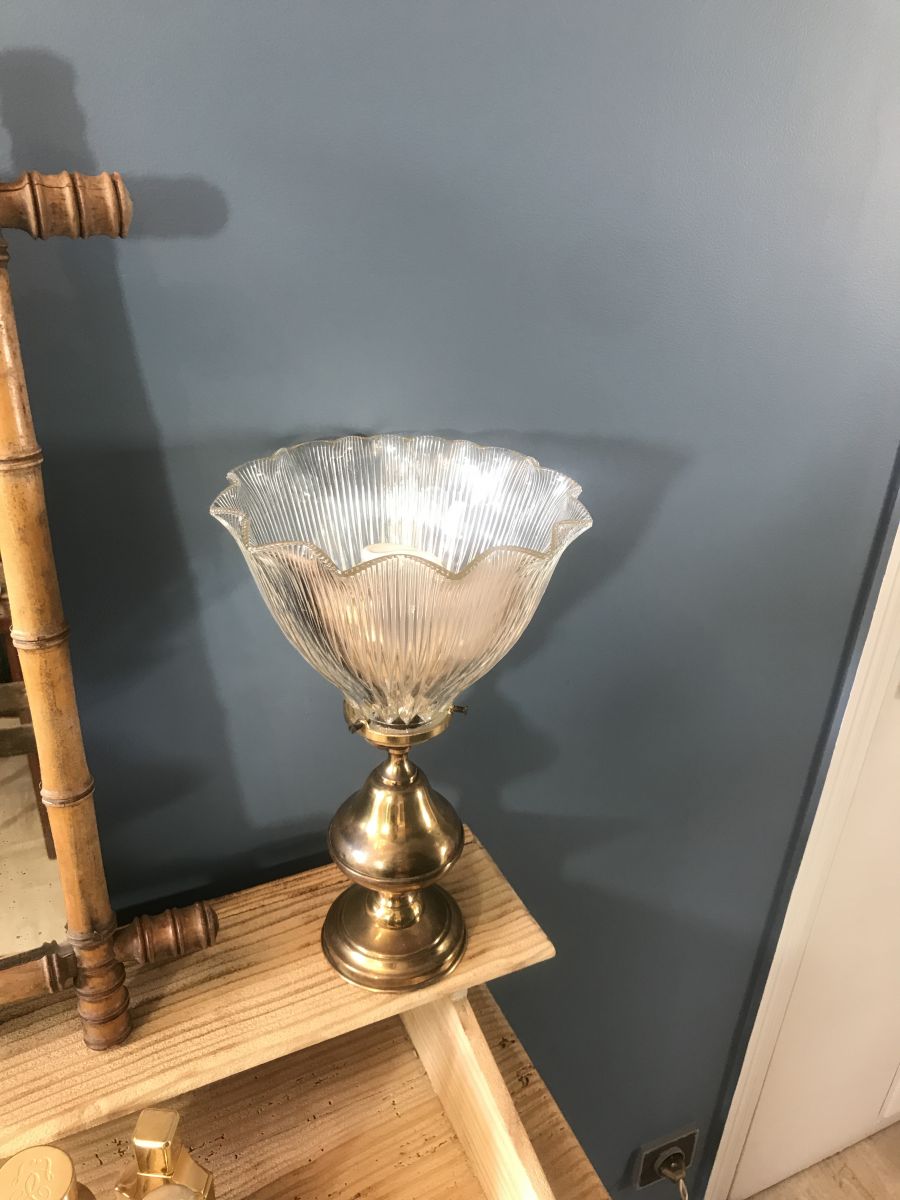 Jolie lampe fleur 1960 en métal doré et tulipe en verre.