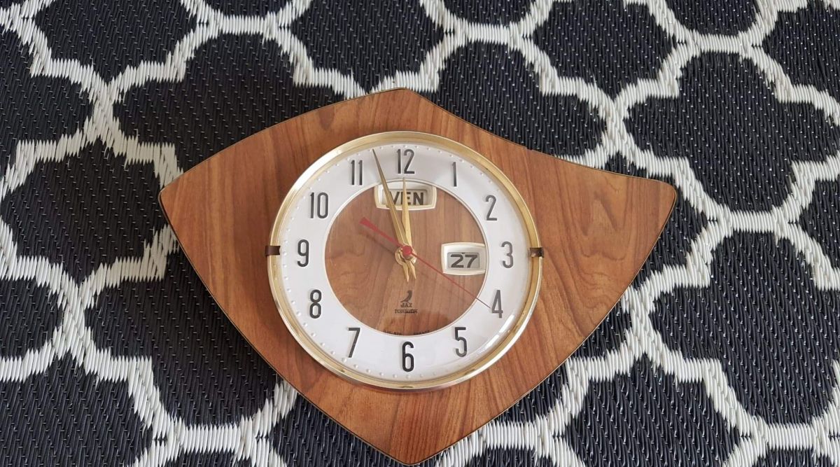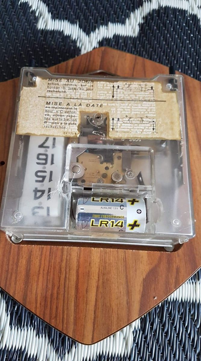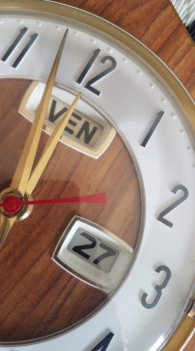 pendule murale Garnic Jaz 1966/67 en formica couleur Noyer du Quercy avec dateur