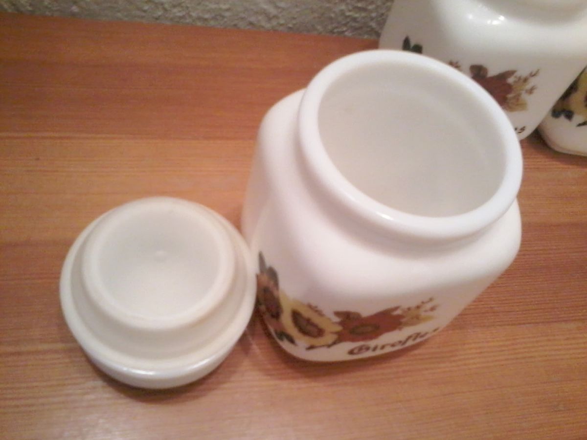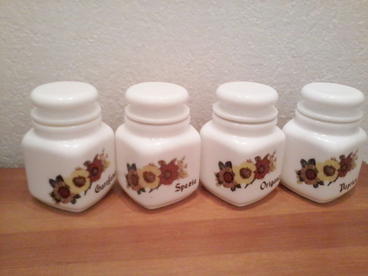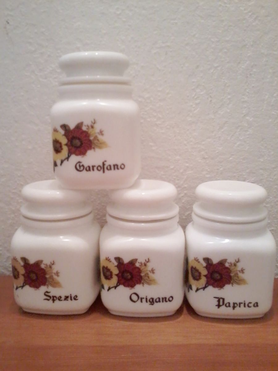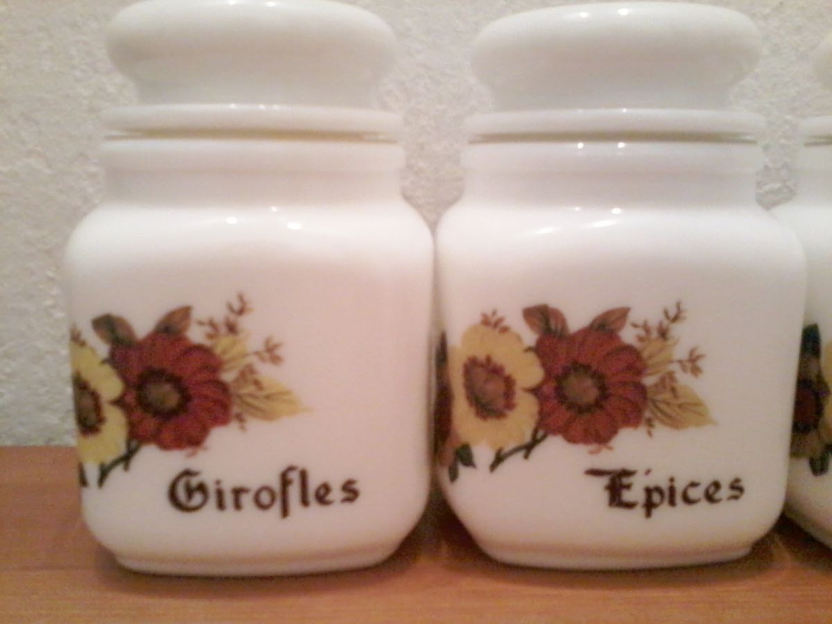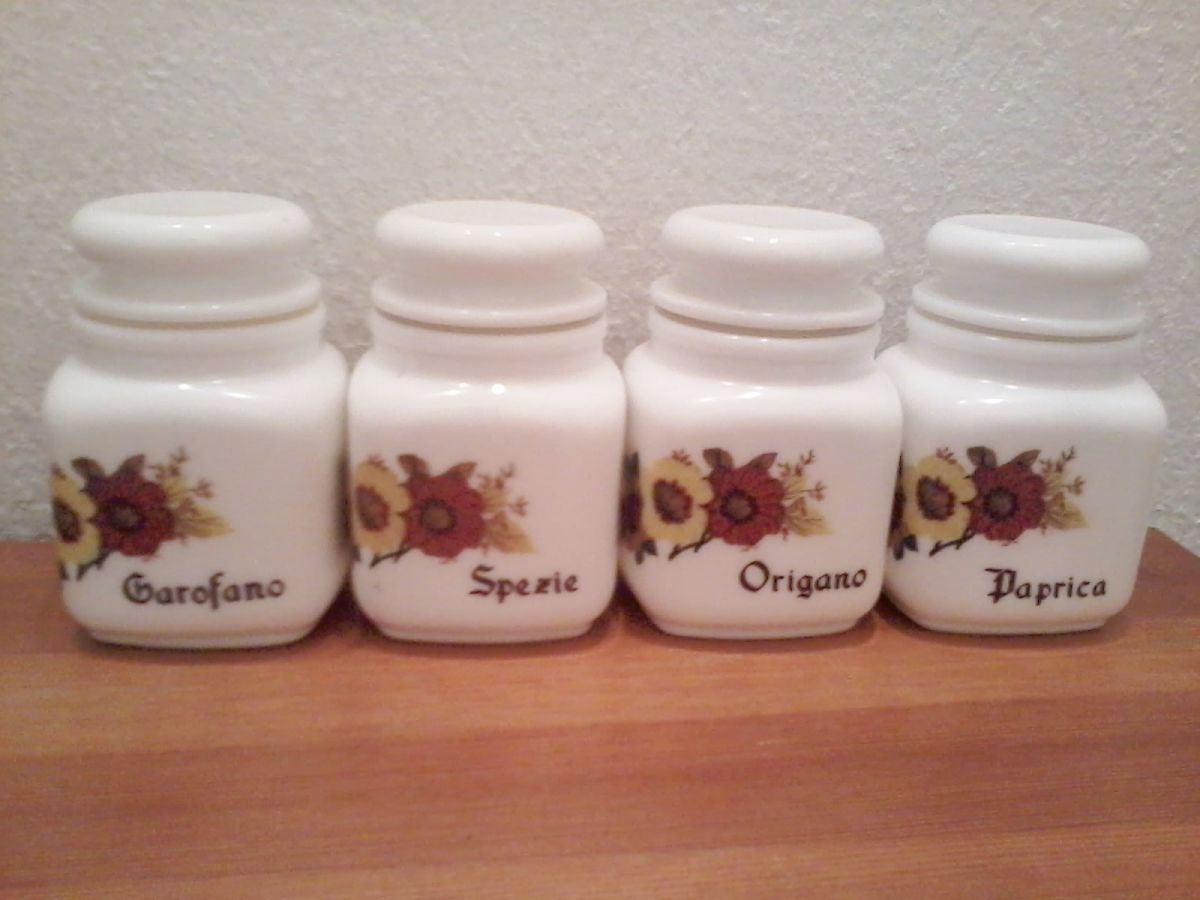 Pots à épices vintage en opaline inscription en Français et en Italien coloris blanc motif fleurs dans les tons orange brun jaune , Décoration cuisine, Années 70