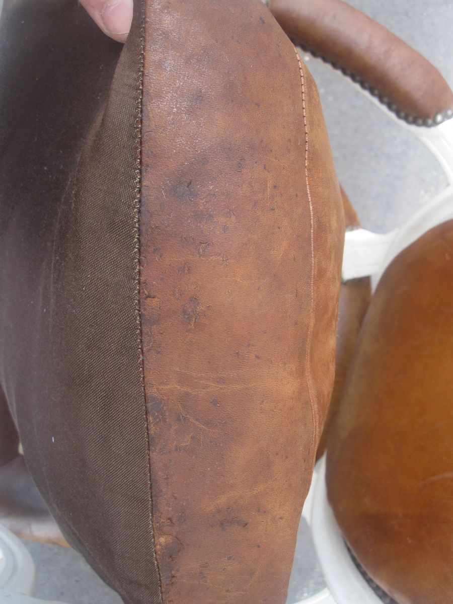 Hauteur assise 47 cm. Diamètre assise 59 sur 42 cm. Quelques éraflures sur la structure en bois et sur le cuirs. Reste en bel état .