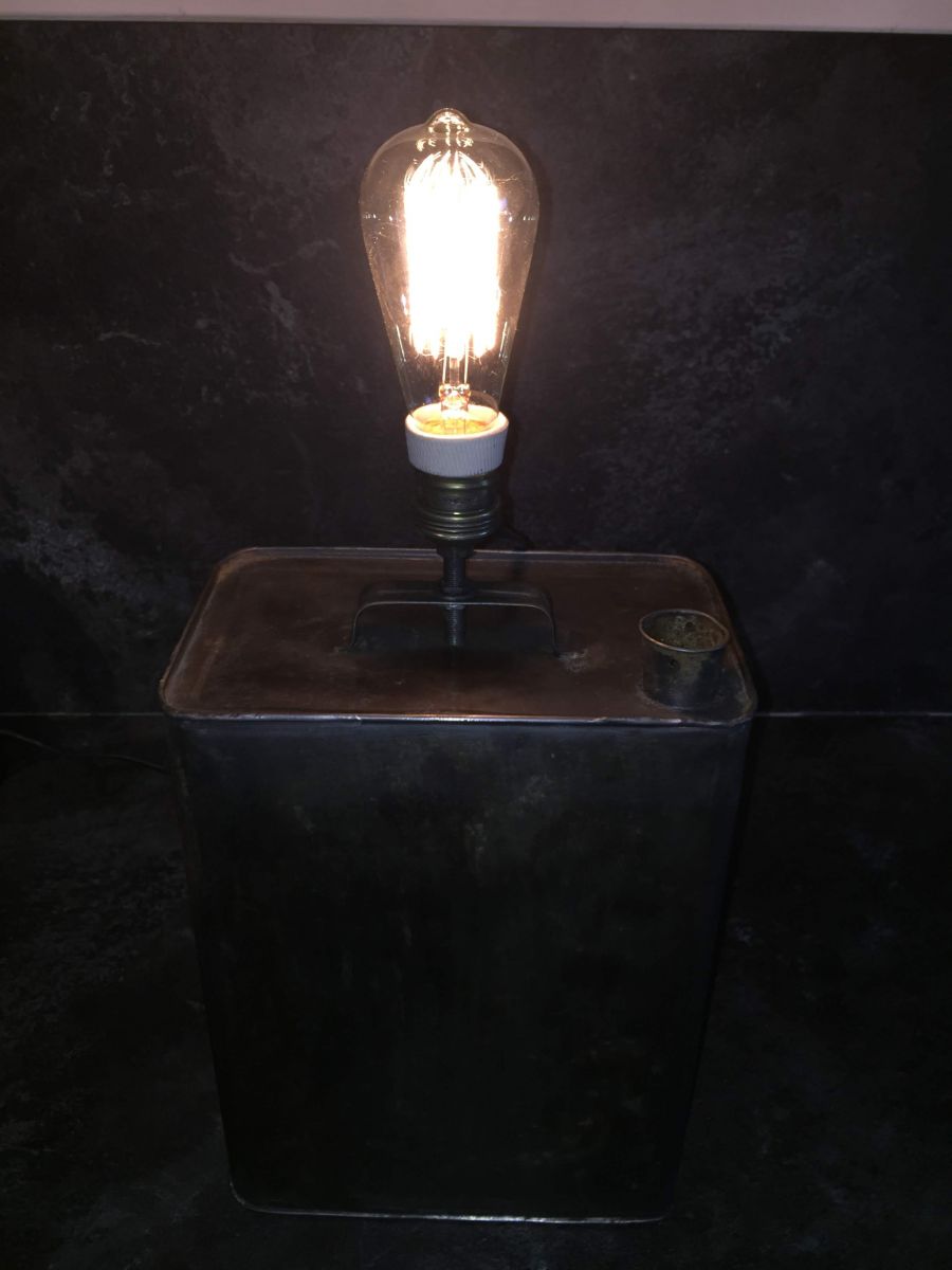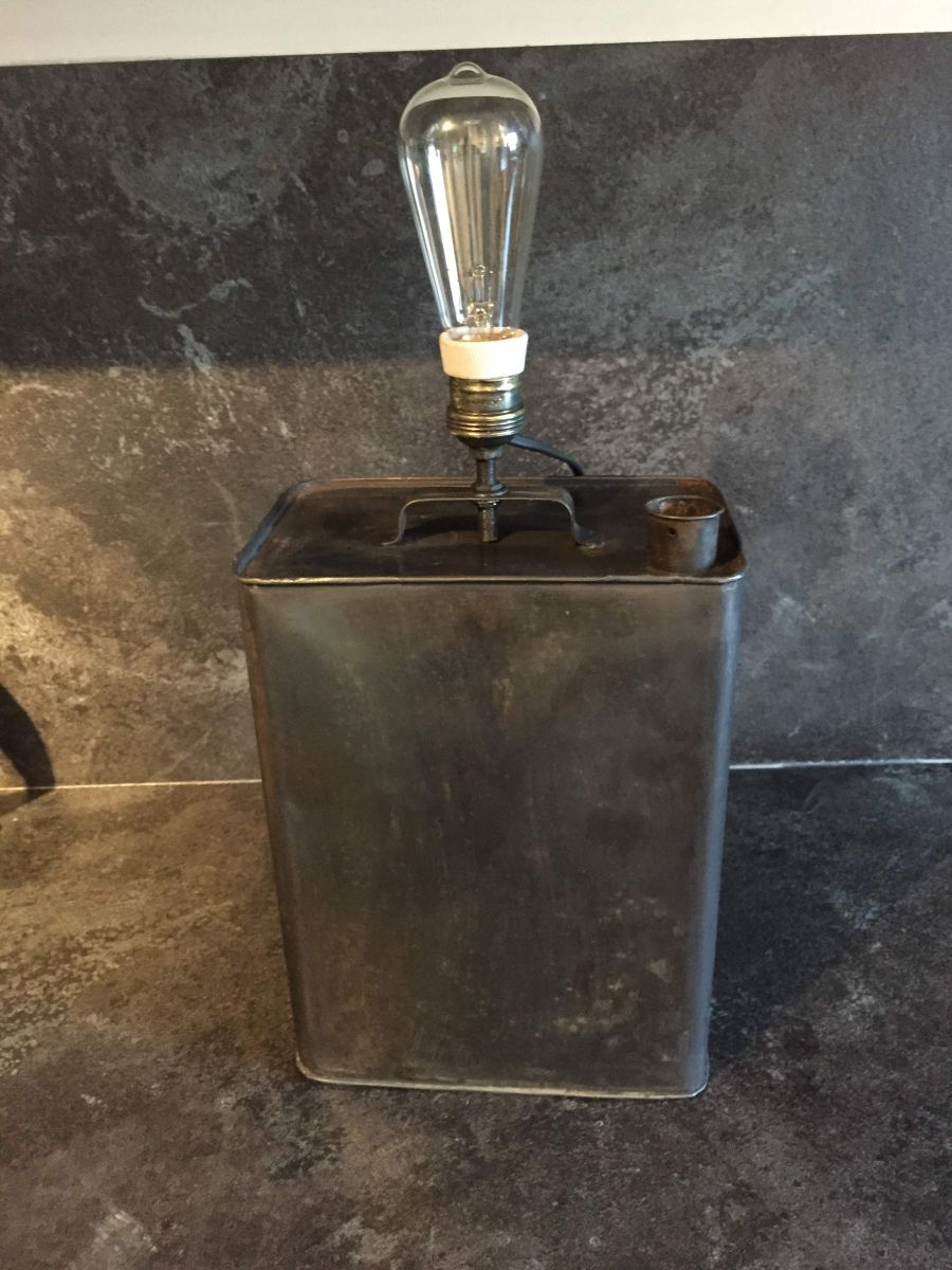 Belle lampe, fabriquée avec un bidon ancien d’essence décapé patiné, équipement électrique aux normes
