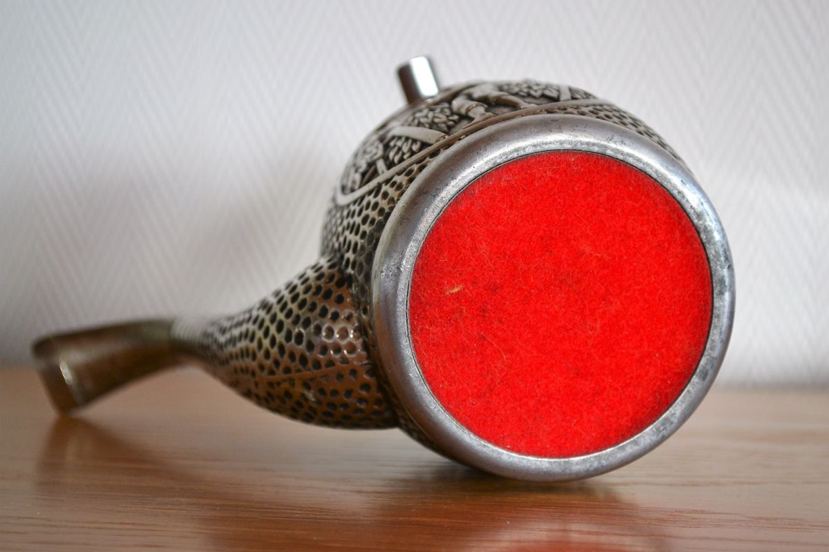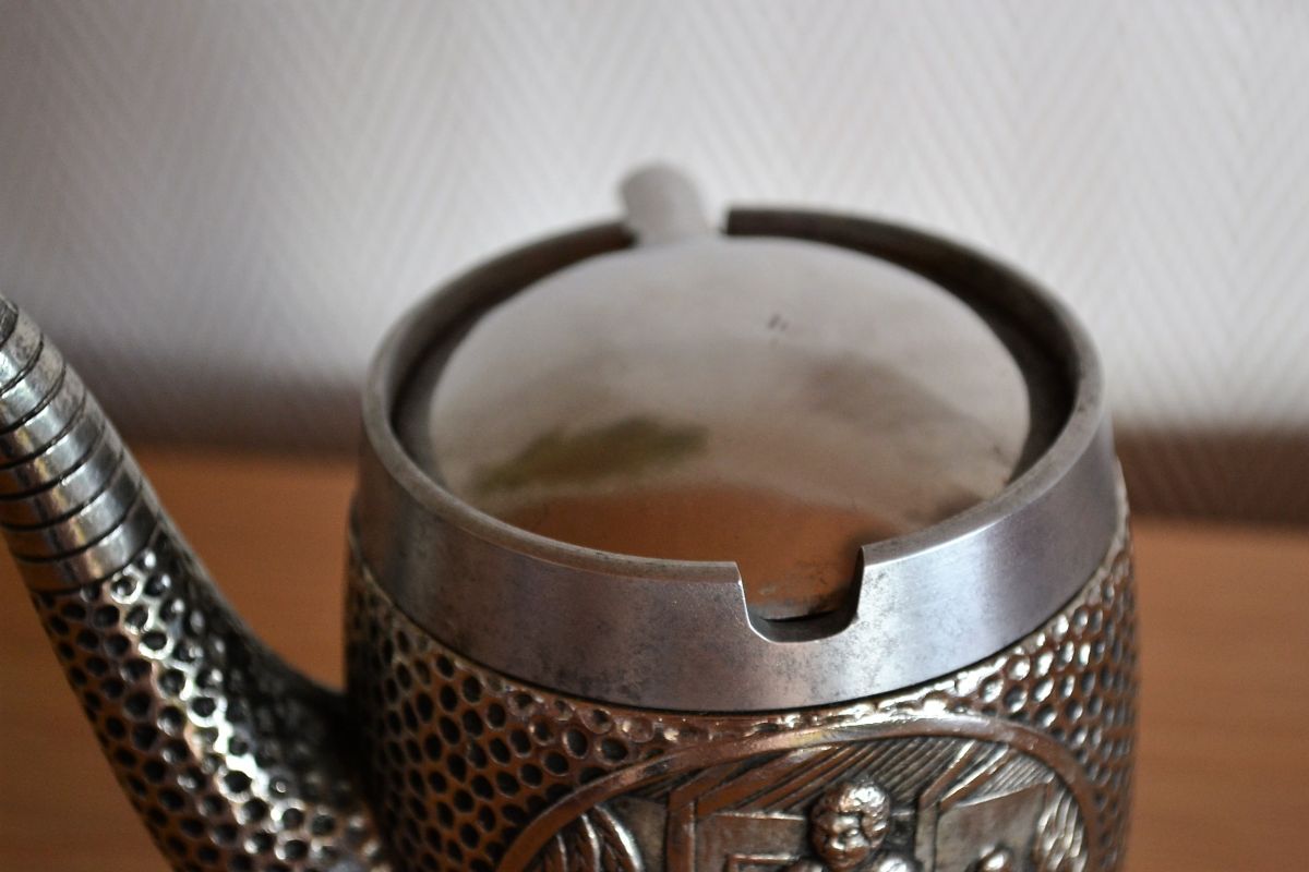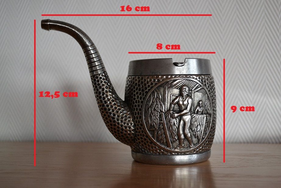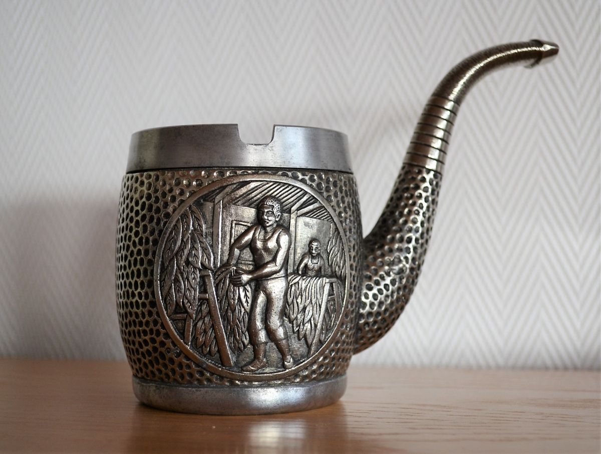 Ancien cendrier en métal argenté, forme de pipe décor "Séchage des feuilles de tabac"
