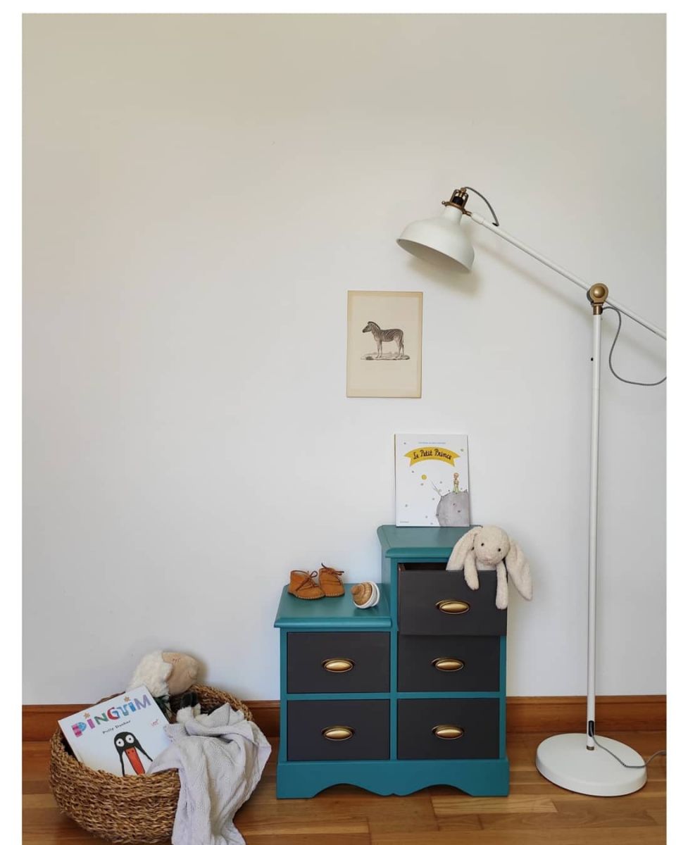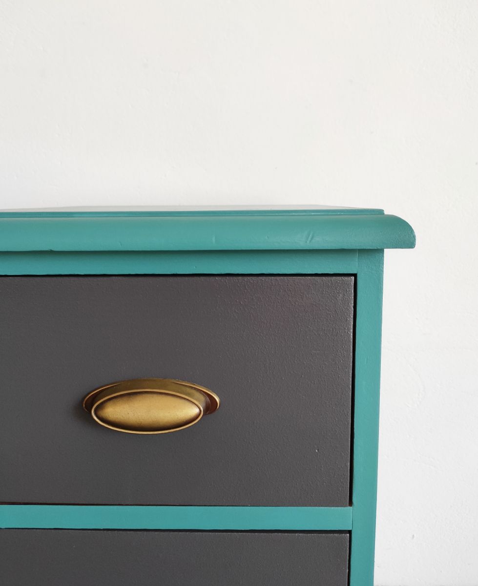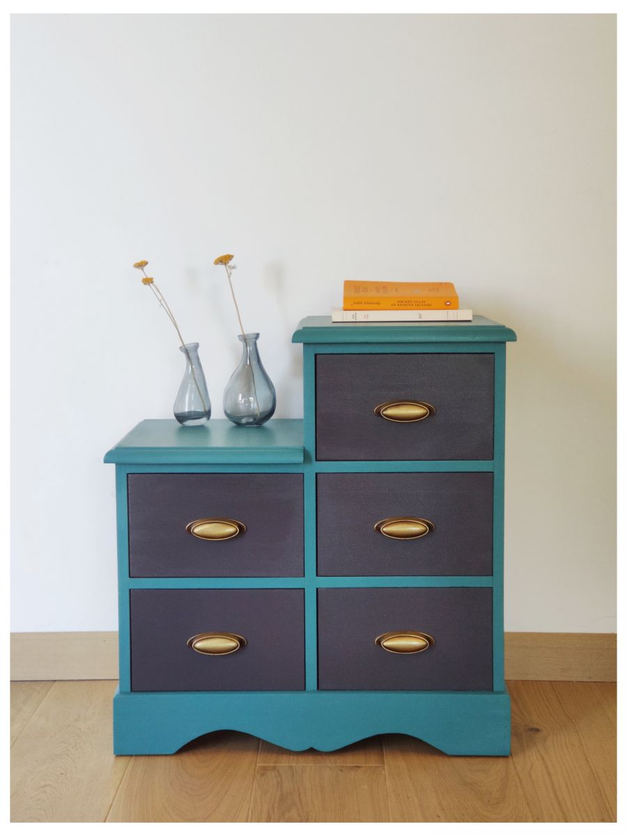 Petit meuble rénové avec 5 tiroirs en bois 5a noter que la partie de derrière le meuble n'est pas en bois), et poignées en laiton.