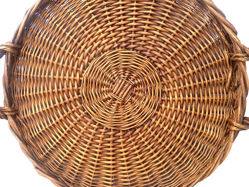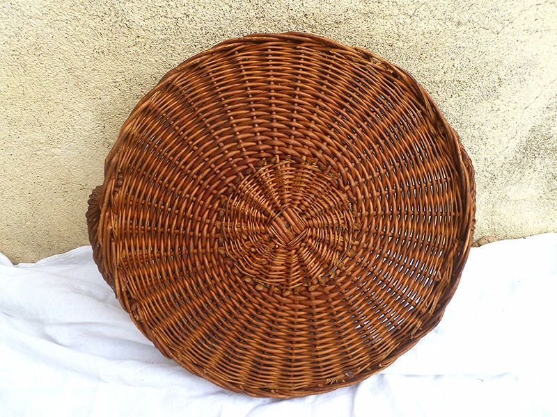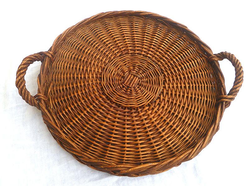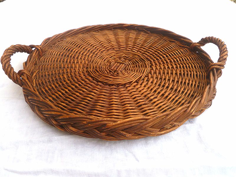 ancien plateau DE service présentation rond en osier tressé avec 2 anses