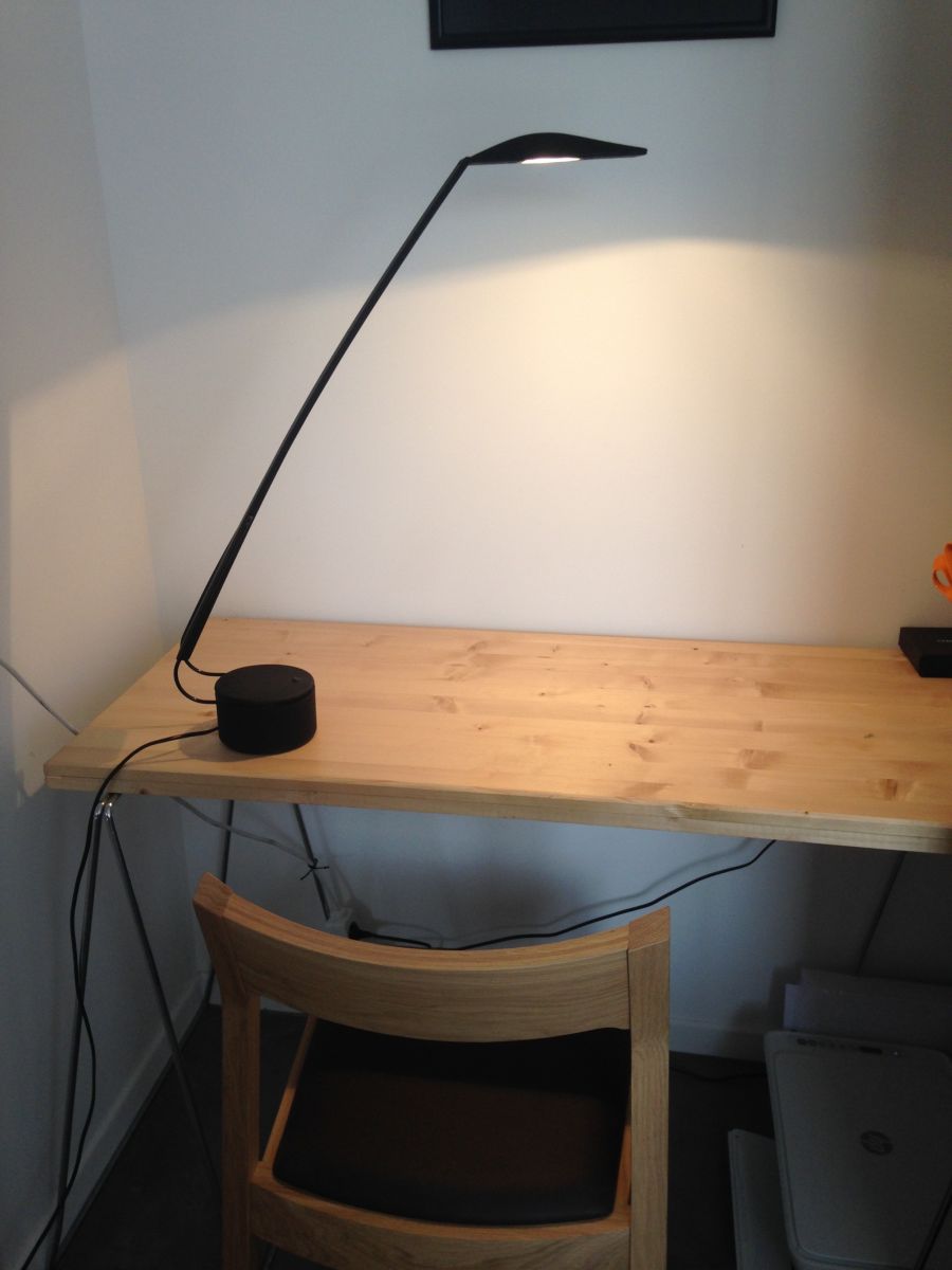 Double interrupteur pour moduler l'intensité de la lumière. Le bras s'articule et la partie supérieure s'incline presque à 180°.