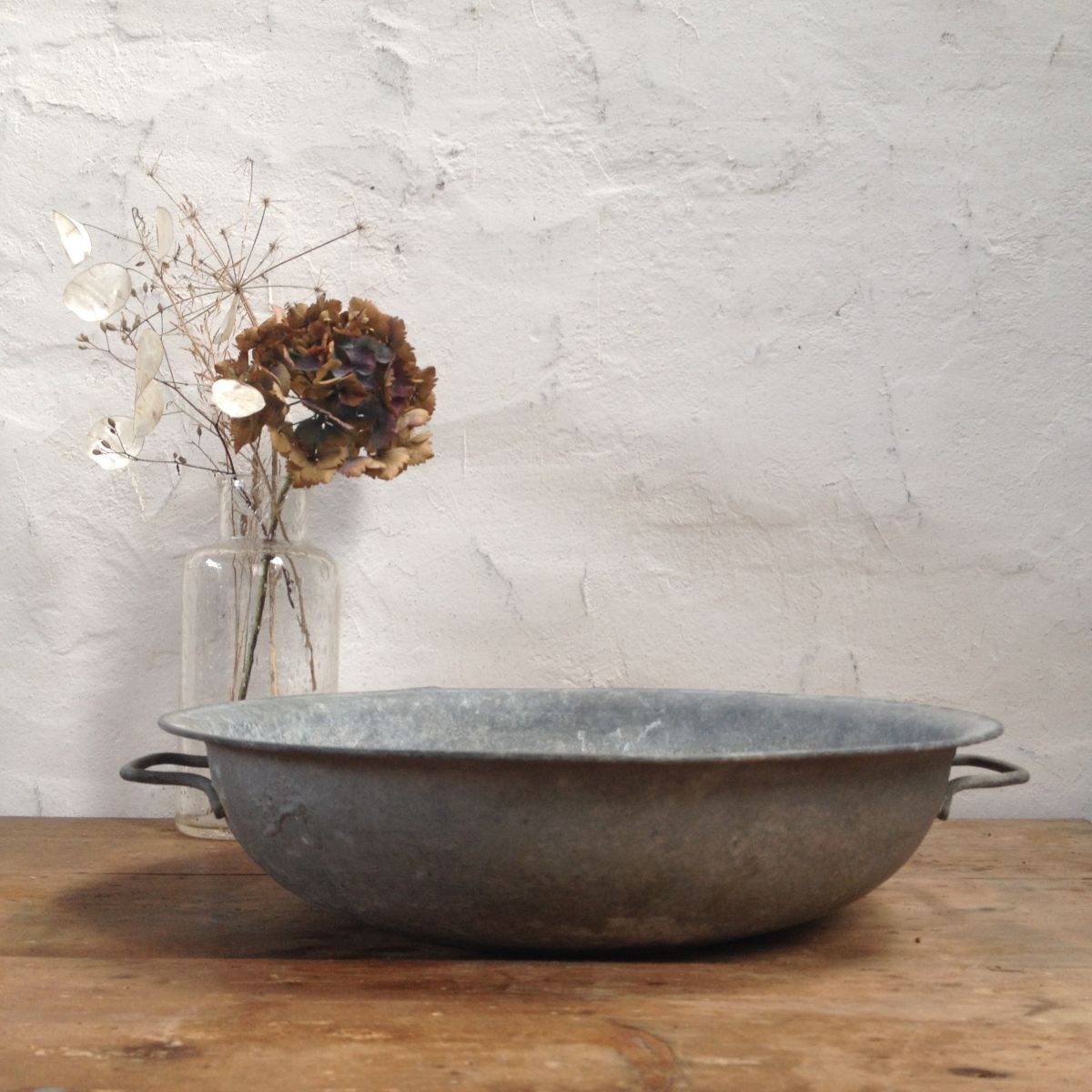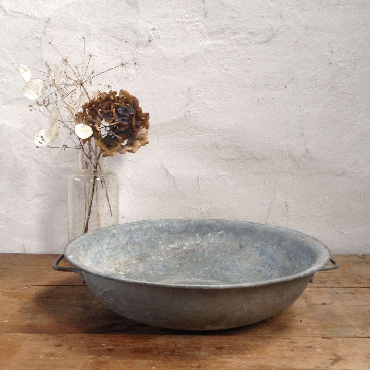 Belle bassine en zinc à deux poignées, naturellement patinée par le temps.