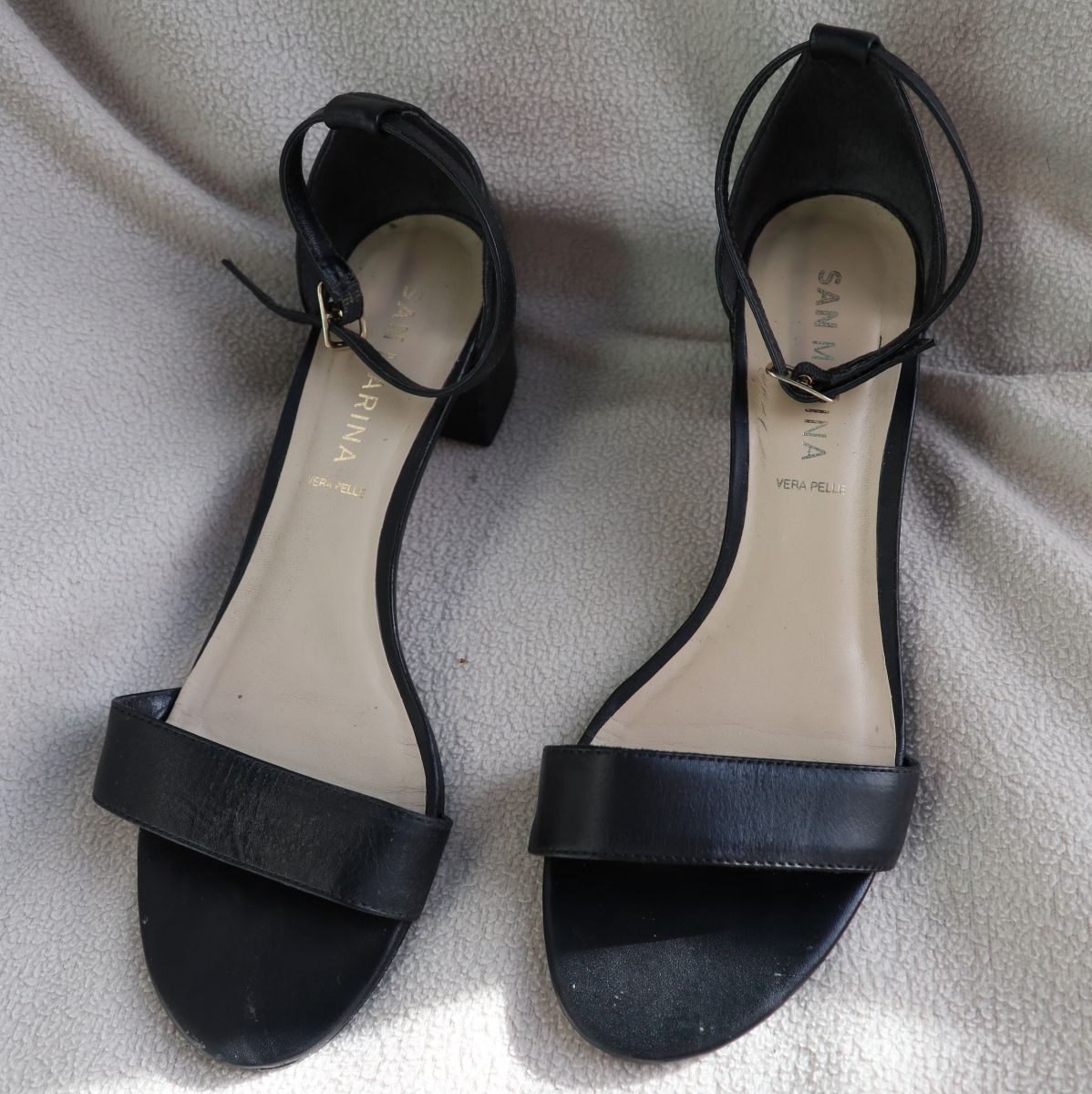 Sandales noires très peu portées, tout cuir sauf semelle extérieure; talons de 3,5 cm à la base.