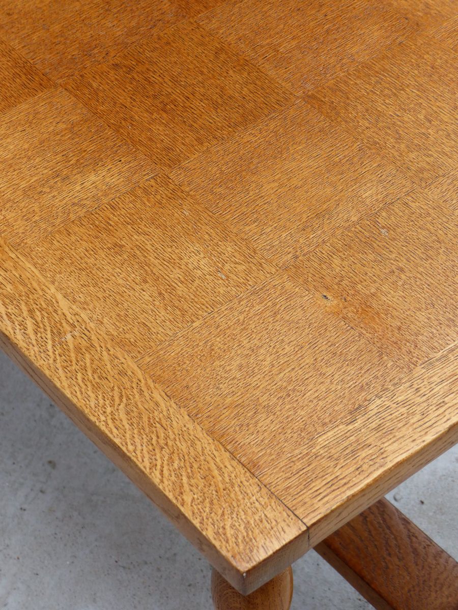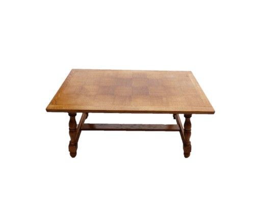 Table basse rustique, plateau en bois recouvert de placage en damier. Pieds tournés. Le tout vernis couleur miel. Bon état général, mérite un petit entretien. Dimensions : P 50 cm, L 92 cm, H 47 cm