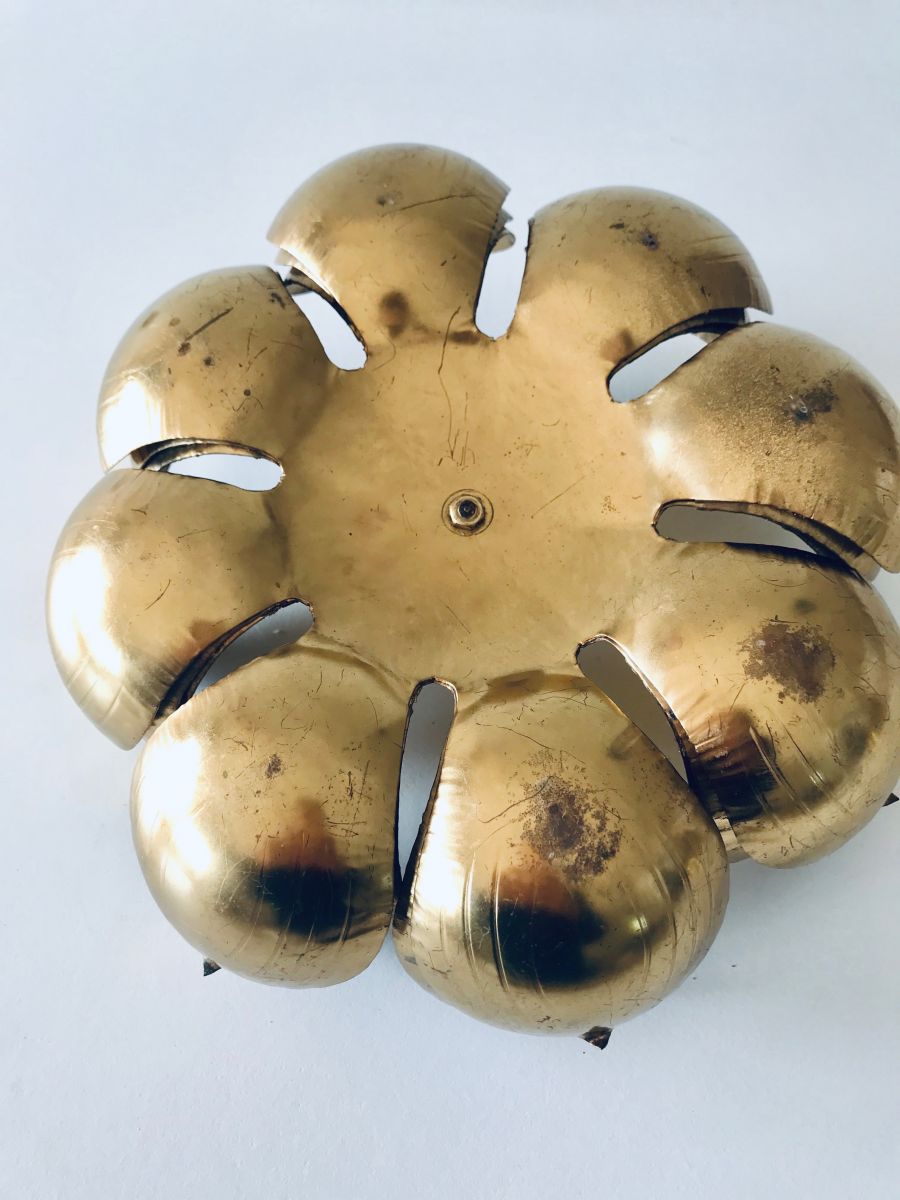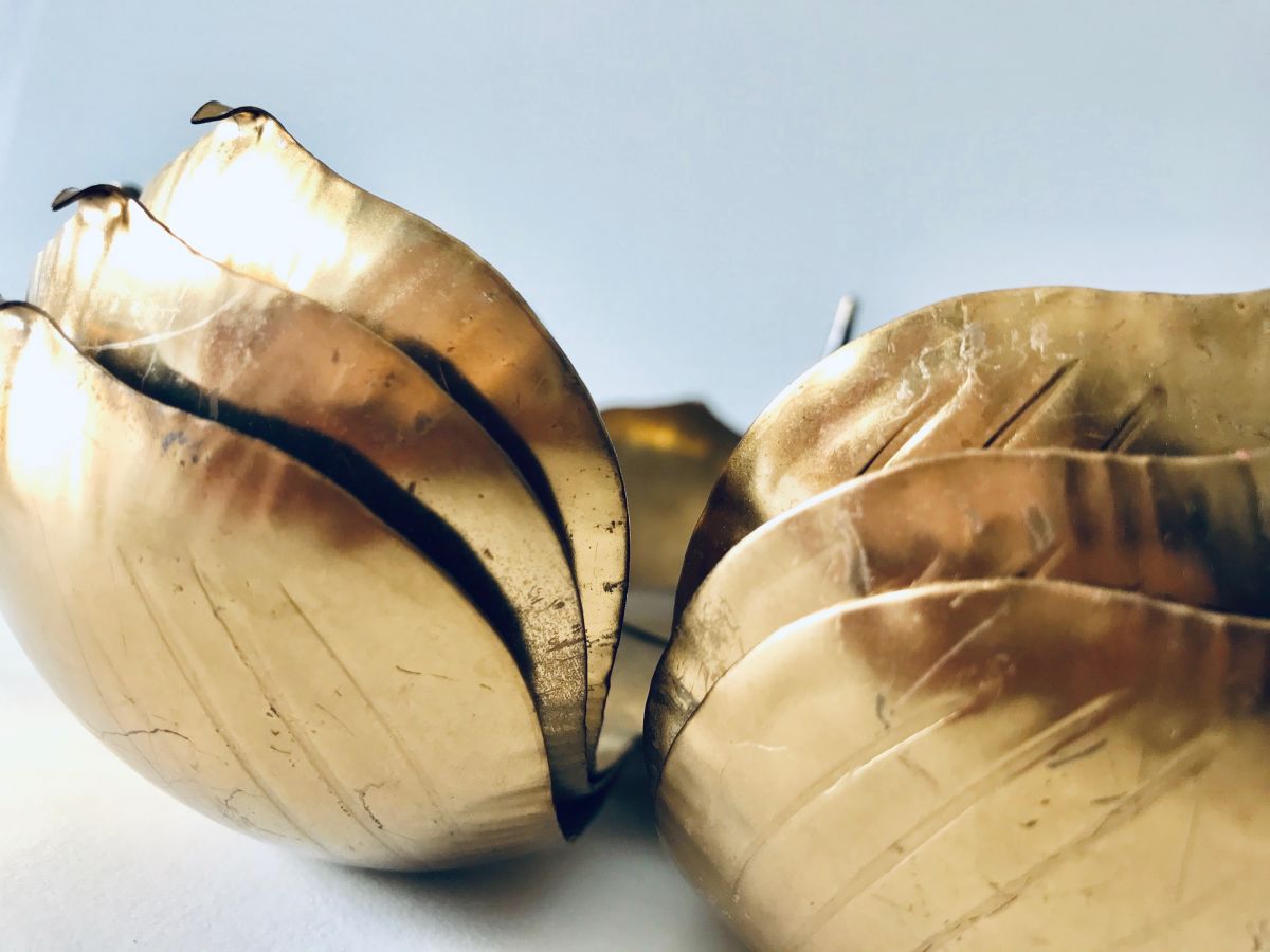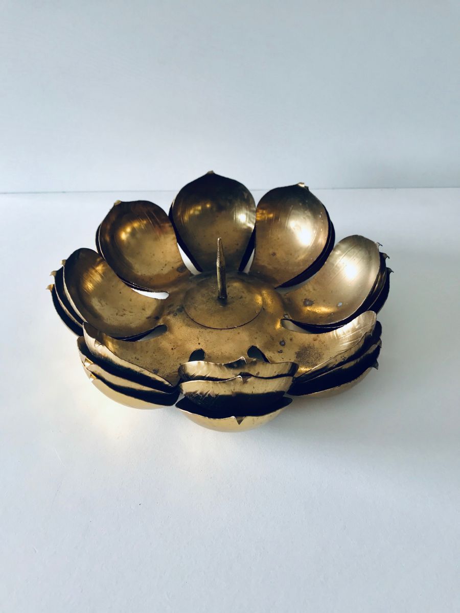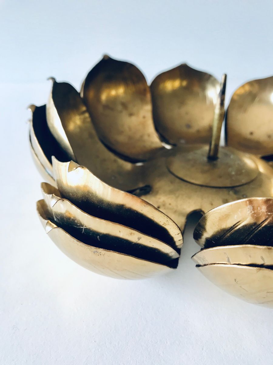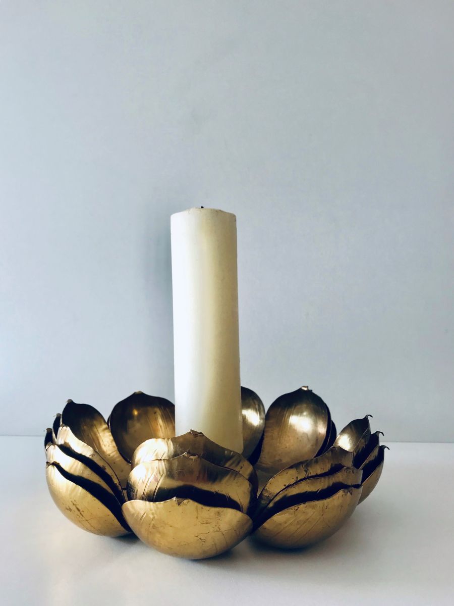 Superbe pique cierge comme on en trouve très rarement représentant une fleur de lotus. Ce bougeoir années 50 en laiton doré dans l’esprit des luminaires Feldman, a un charme fou. Il est grand et composé de trois rangées de pétales qui lui donnent un style unique. Les pétales souples pourront être pliés pour créer plus de volumes, surtout à l'intérieur pour envelopper la bougie.