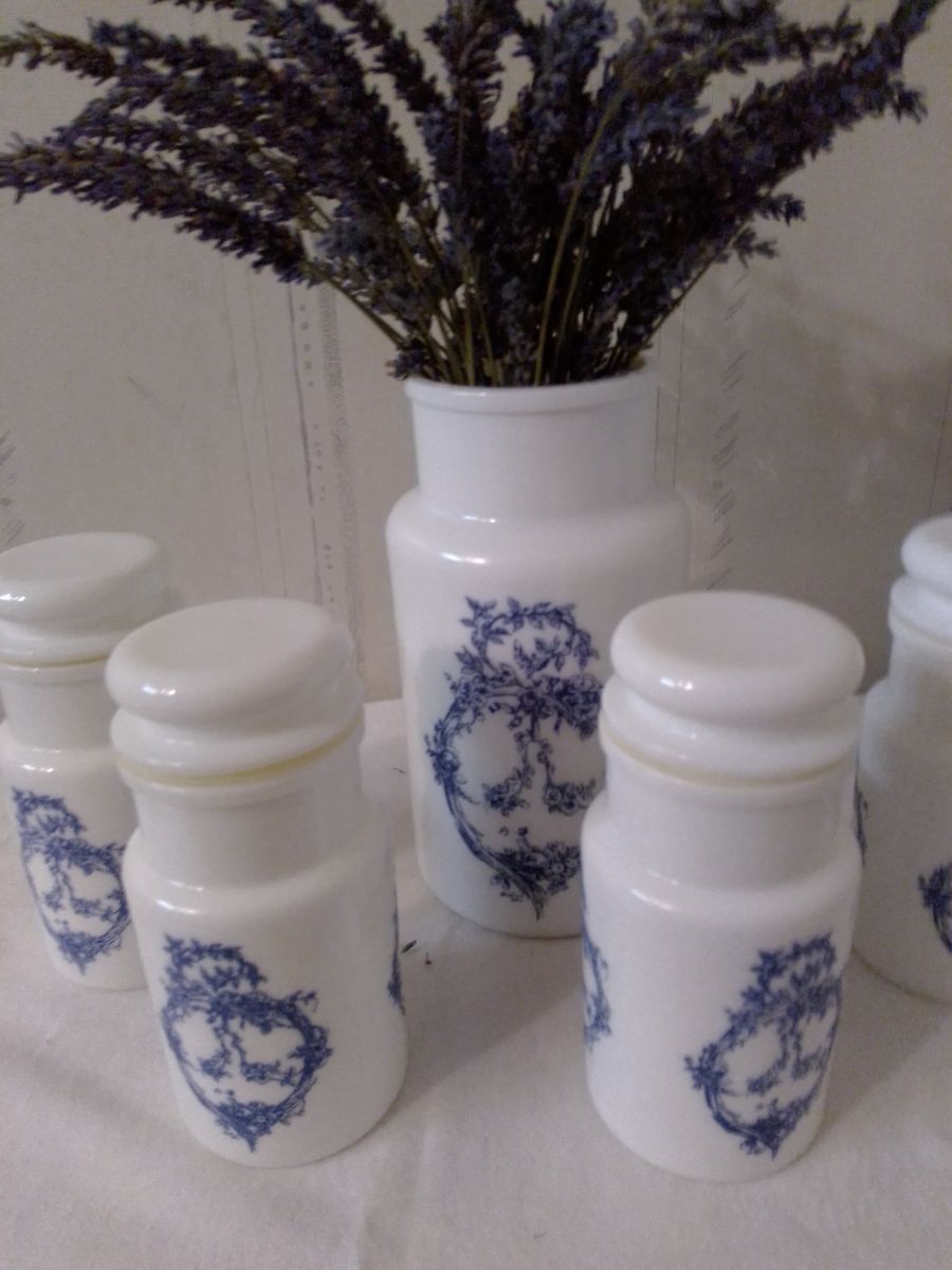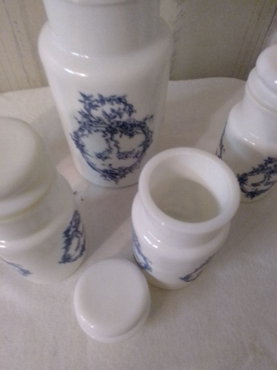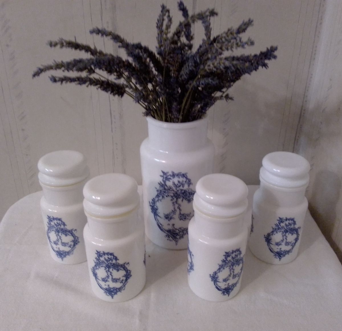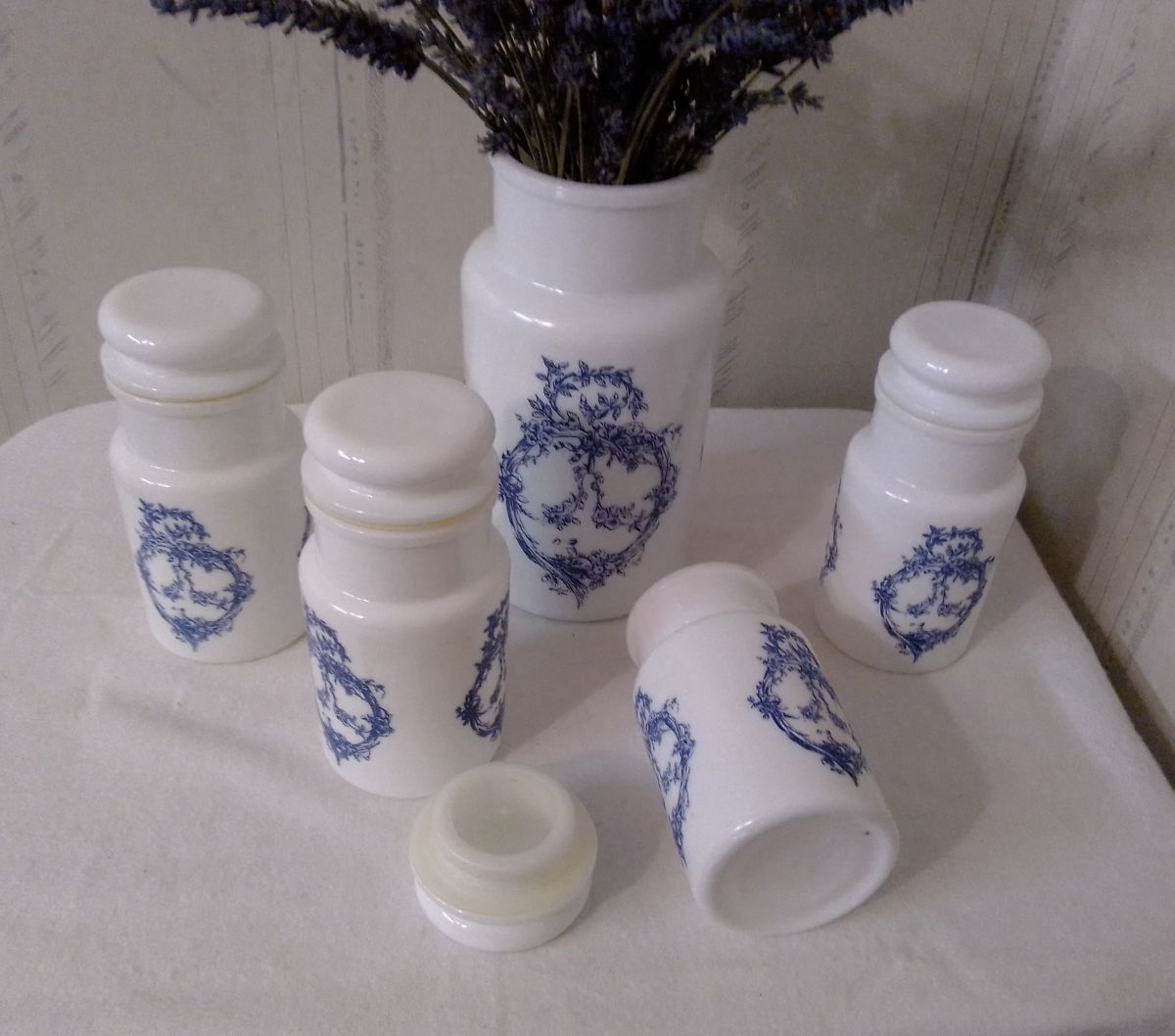 pots d'apothicaire Vintage en verre opale à motifs bleus - Pots à épices, Pots à pharmacie