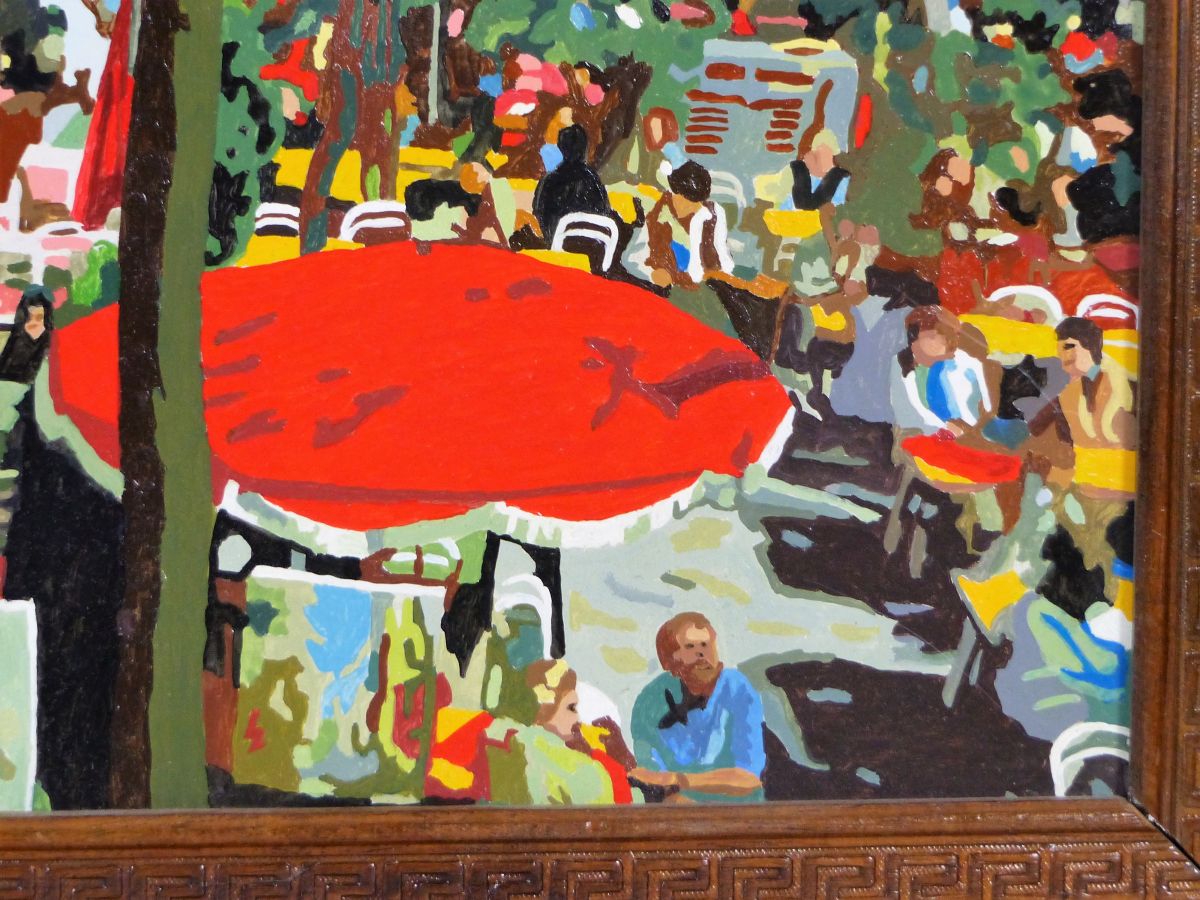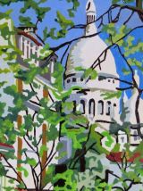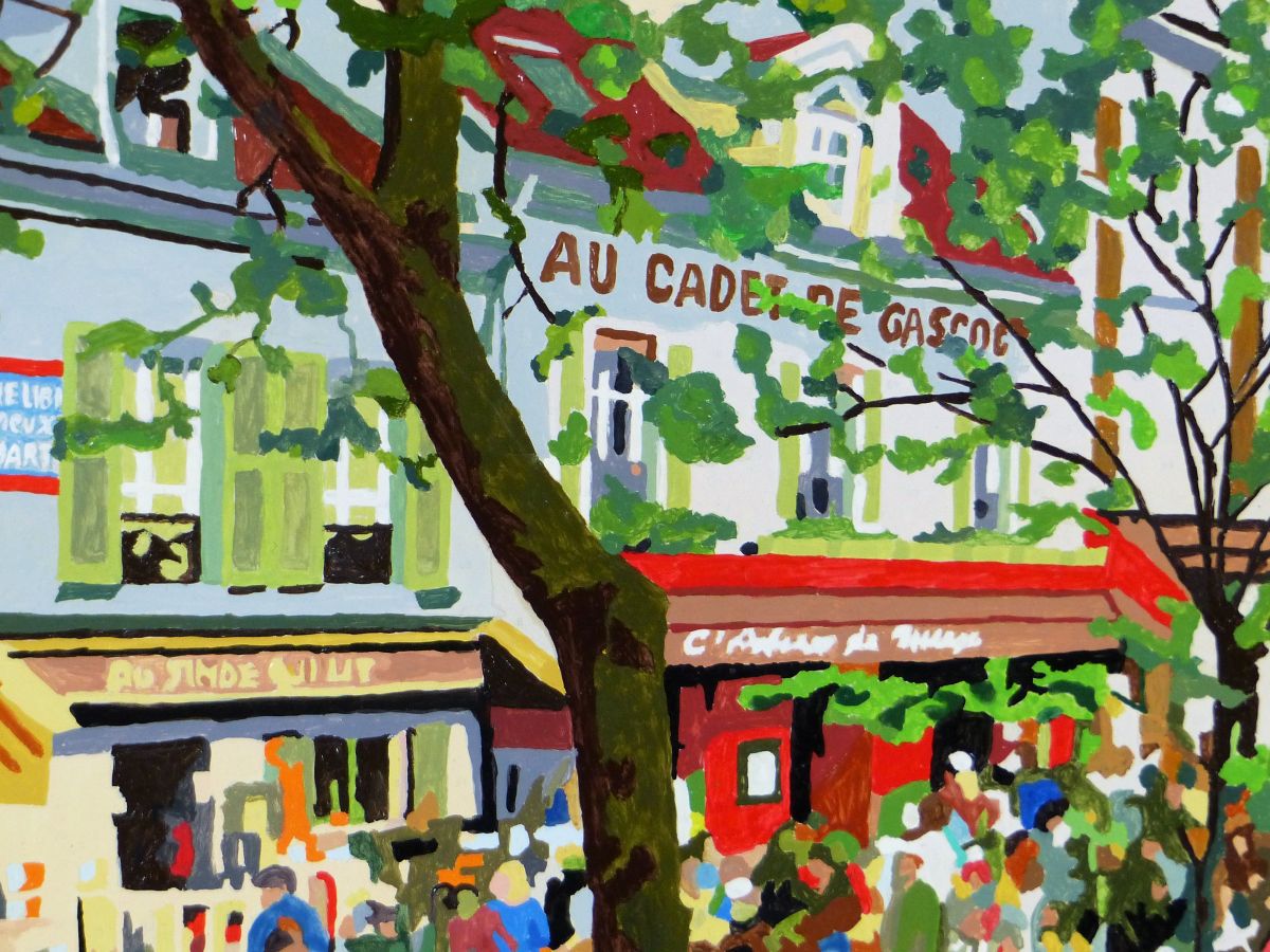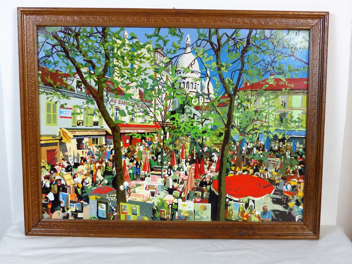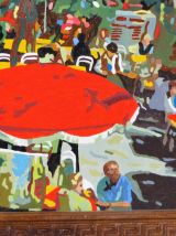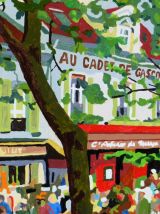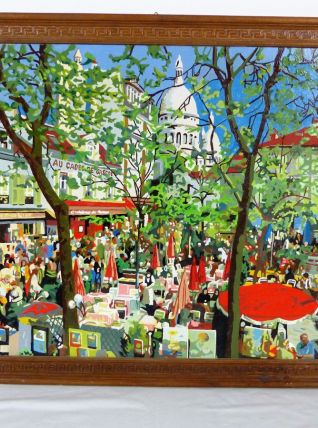 Huile sur panneau de bois thème place du tertre/ Montmartre, de belle taille. Thème courant, mais très jolies couleur et un petit quelque chose de très charmant. Encadrement de bonne facture, un peu en décalage par le style. Dimensions 57 cm, 75 cm.