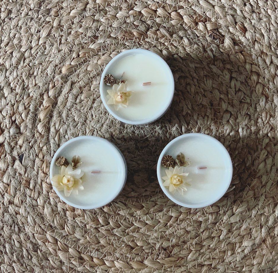 Petite bougie créé à base de cire végétale de soja parfumé à la fleur de coton et sublimé par ses fleurs séchées, top de la tendance !