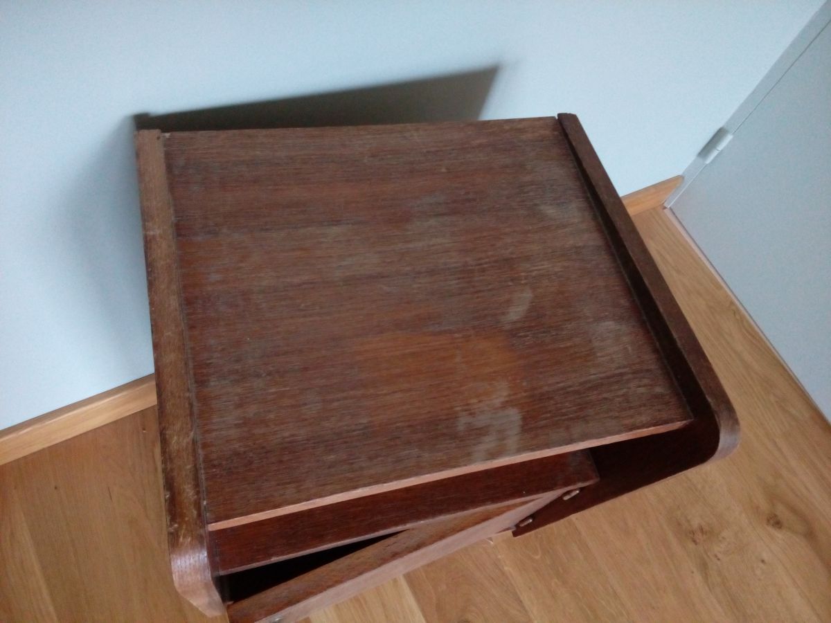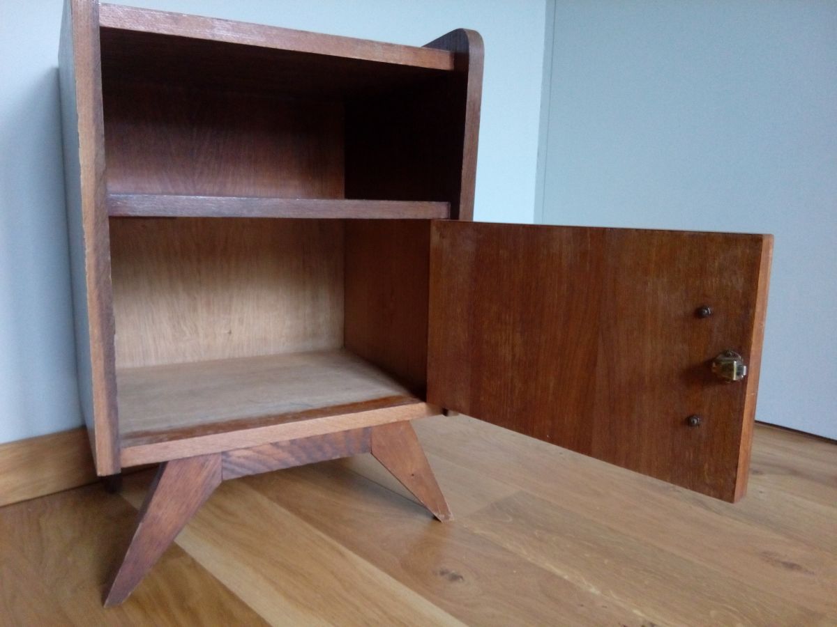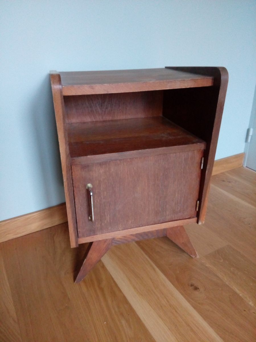 Ce joli chevet, ou table de nuit, qui doit dater des années 50 (ou 60?). Il a un design très sympa avec ses petits pieds compas. Il est aussi très pratique avec ses deux niches, dont l'une est fermée par une porte. Il est encore solide, en bon état général, mais il demandera au minimum un revernissage ou mieux, un beau relooking d'où son prix relativement bas. Il présente donc des taches et rayures diverses, un petit éclat sur le placage sur le coin avant droit quelques trous de vrillettes traités par injection de vinaigre blanc, le coin haut arrière droit est un peu abîmé (mais ça ne se voit que sur la face arrière, donc invisible s'il est posé contre un mur) Le plateau supérieur est à 56 cm de hauteur. Le chevet mesure 40 cm de large par 35 cm de profondeur maximale, pour une hauteur maximale de 59 cm. Il pèse 9 kg environ.