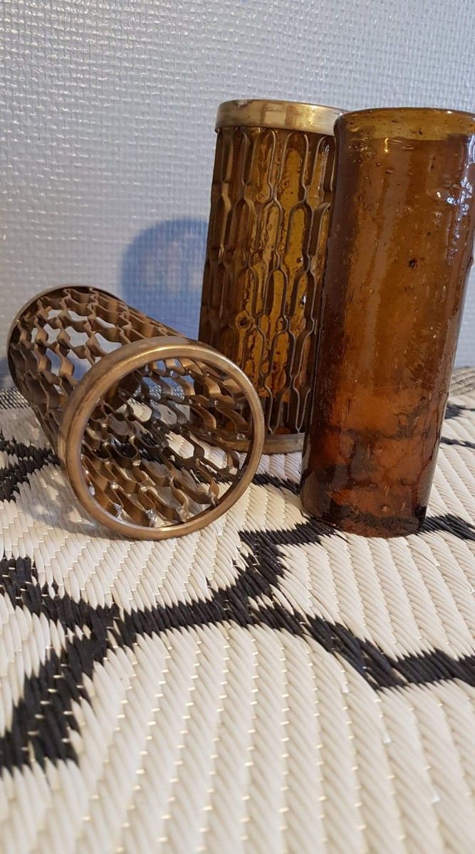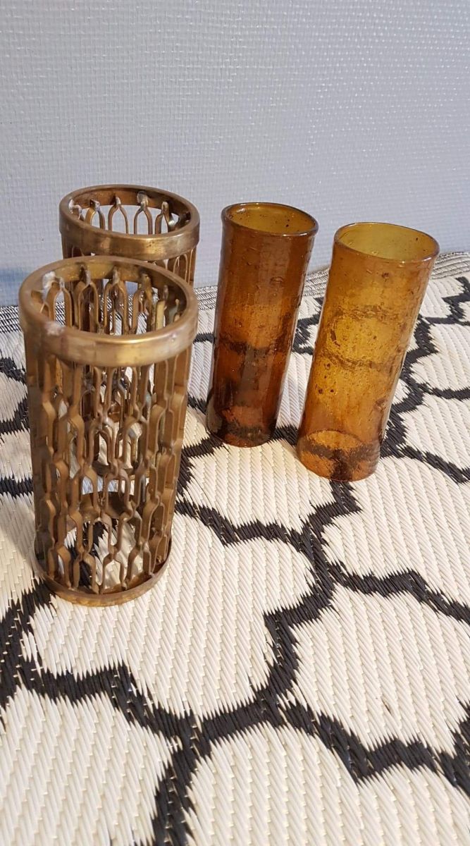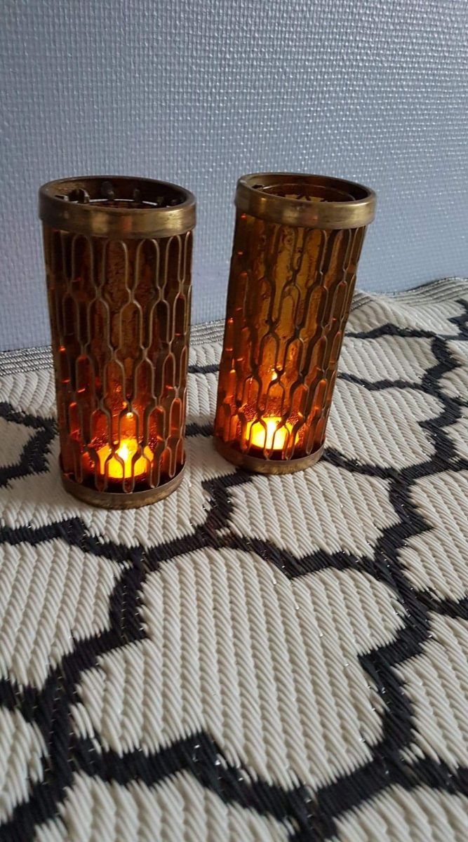 photophores bougeoirs style moucharabieh en laiton et verre bullé orange