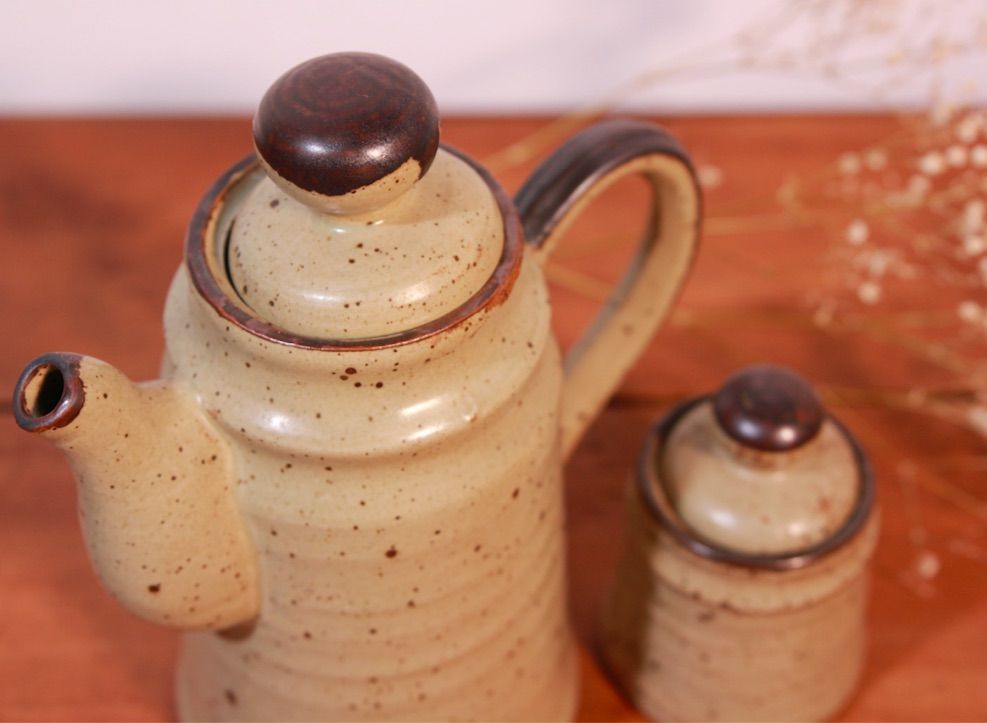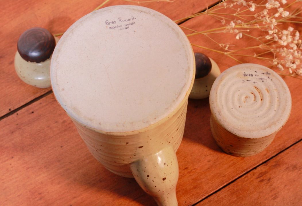 Lot d`une théière et son sucrier signées Grès Rocaille, Japon. Grès pyrité beige. Parfait état, sans éclat ni fèle.