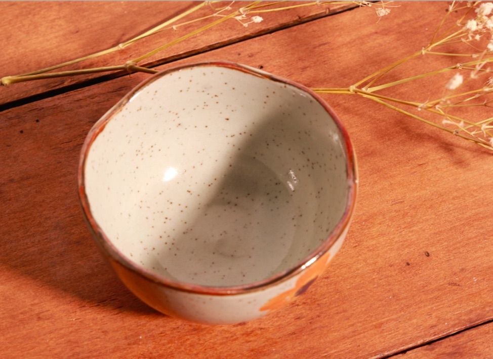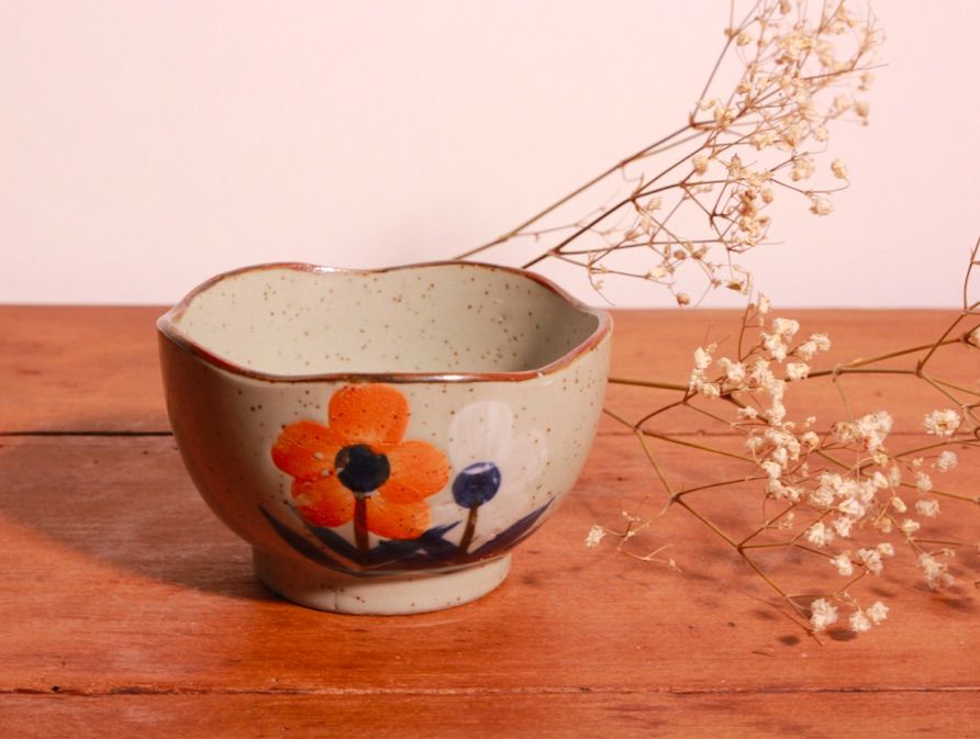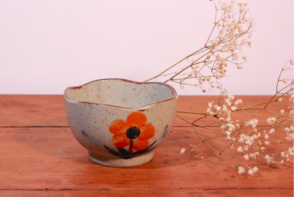 bol en gres gris pyrite peint, fleurs orange et blanche.