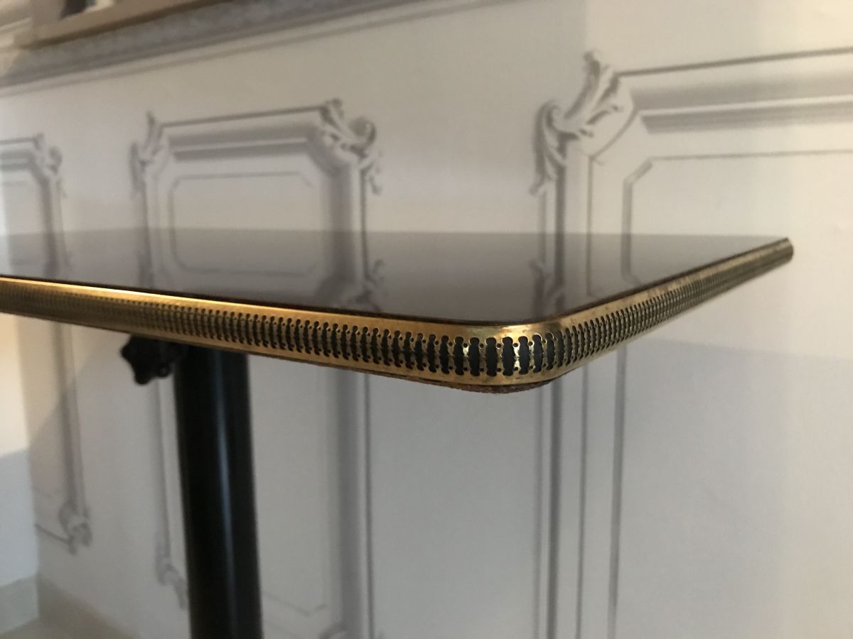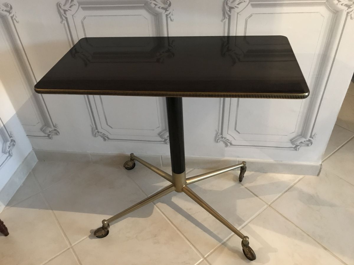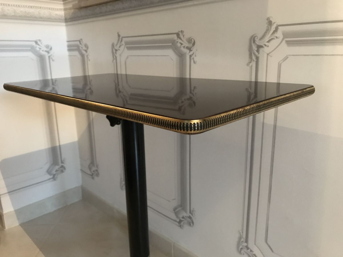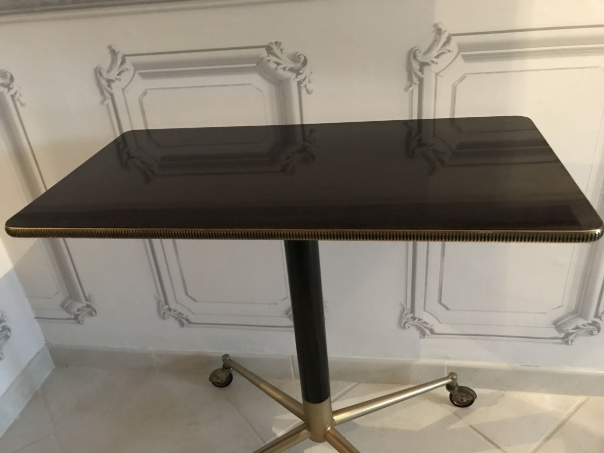 La table possède un plateau en formica orné de laiton travaillé.