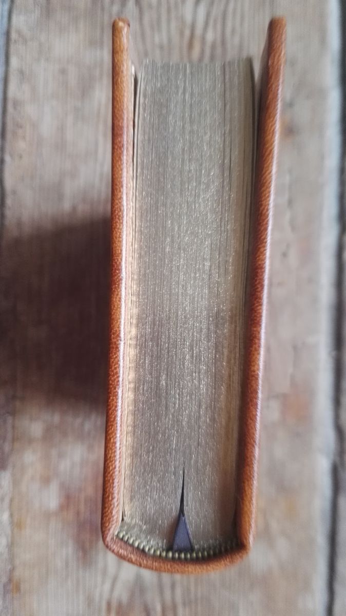Reliure plein cuir de mouton bigarré satiné, tranche or, dos à faux nerfs titré, plats ornés, contreplats papier marbré à coquilles et roulette or