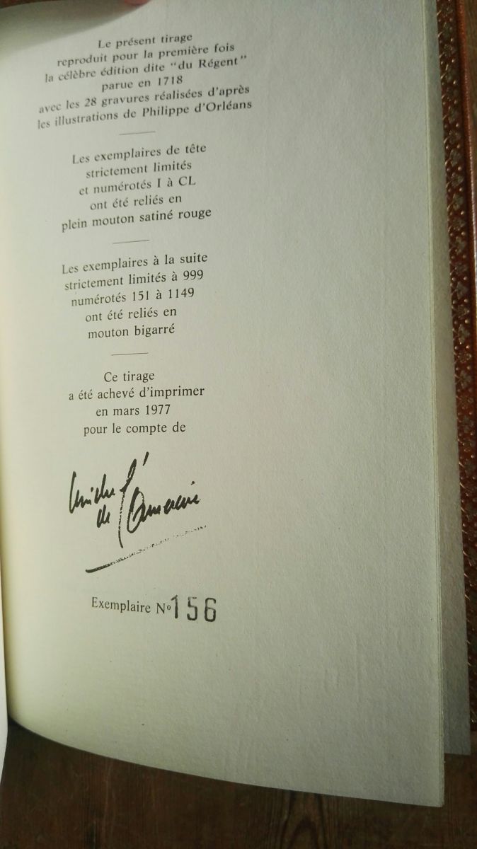 Réimpression moderne de l'édition de 1718 dite "du Régent" avec les 28 gravures réalisées d'après les illustrations de Philippe d'Orléans - 1977, Paris, Edition Michel de L'Ormeraie.