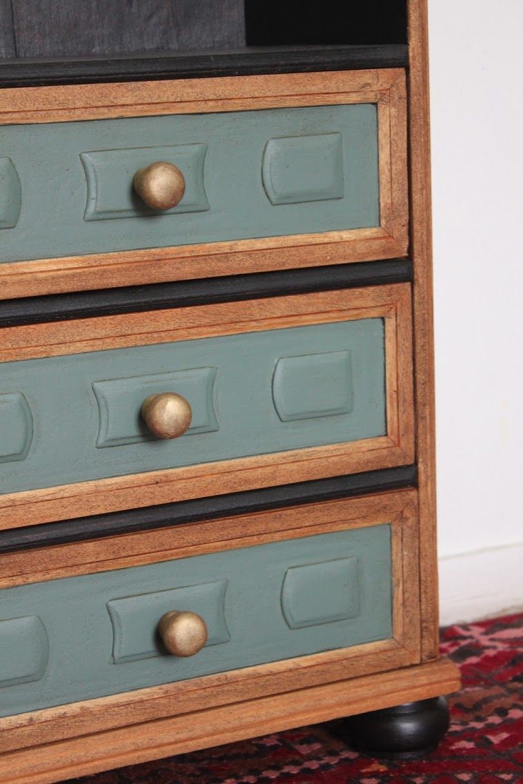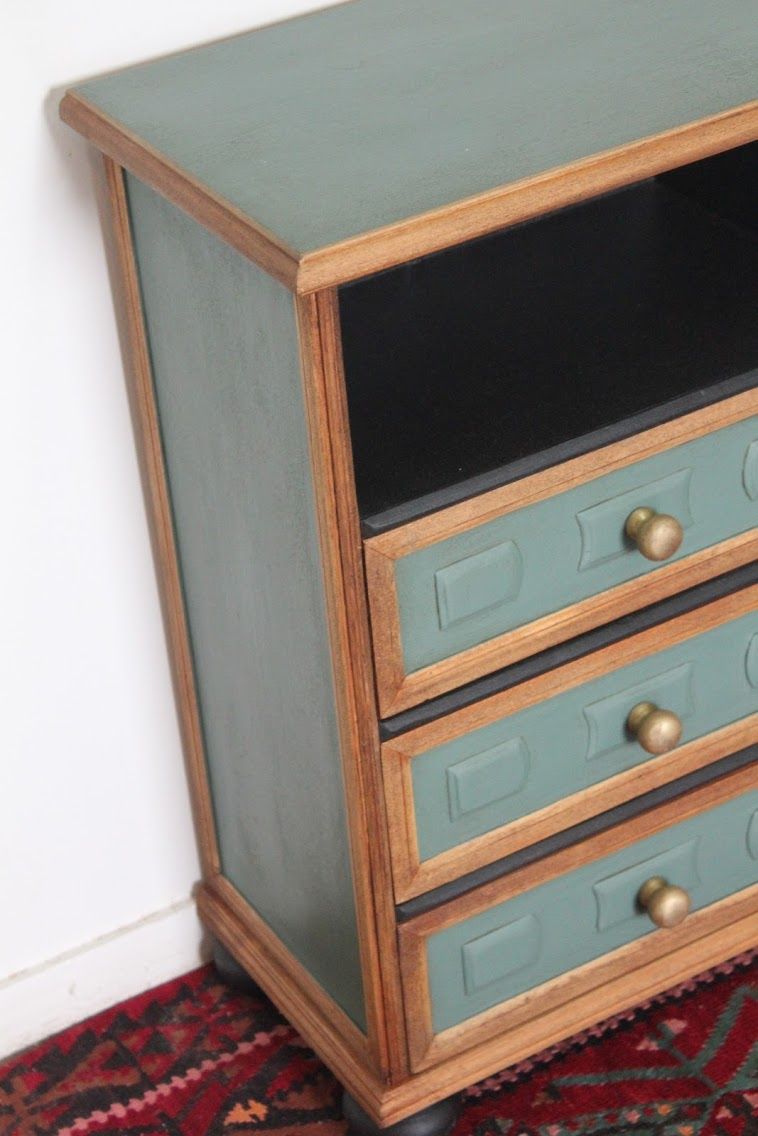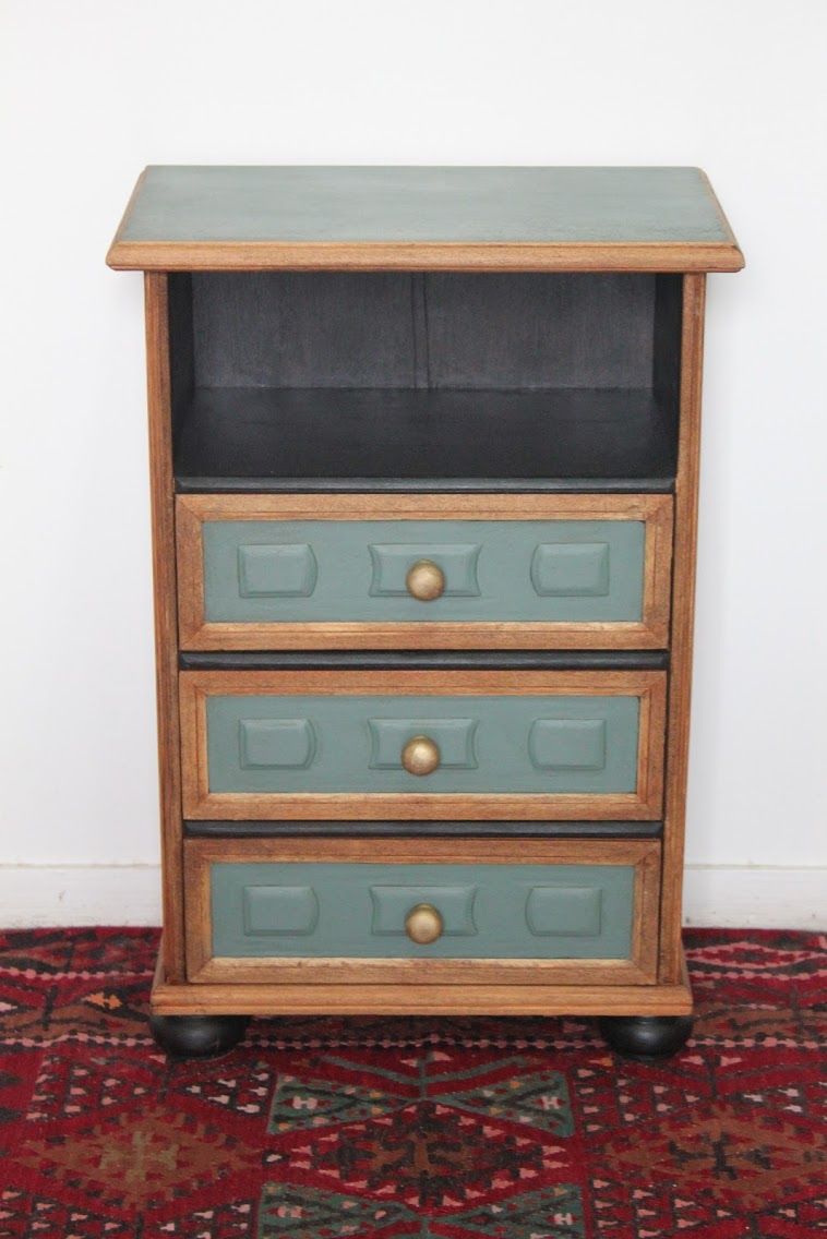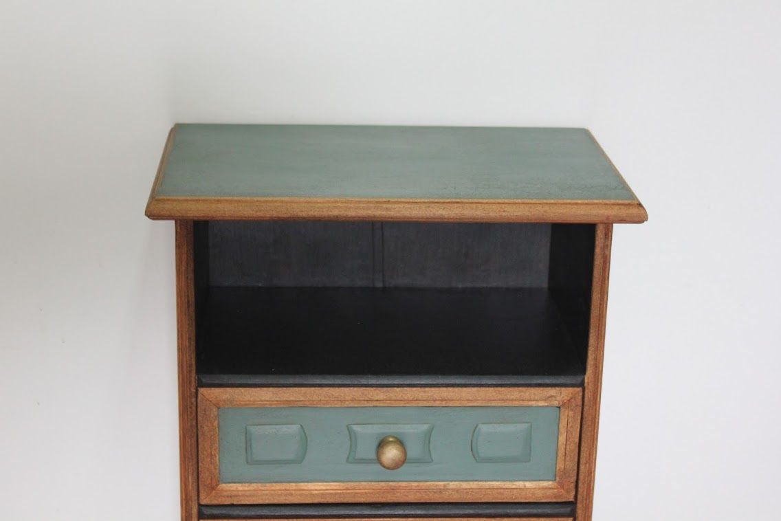 Ce joli chevet contemporain a été entièrement poncé puis certains éléments ont été peint en « green smoke » de chez Farrow&Ball ou en noir. Les poignées ont été doré pour faire ressortir le vert. Un meuble unique en parfait état et avec beaucoup de style!!