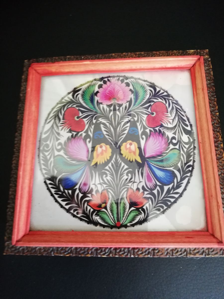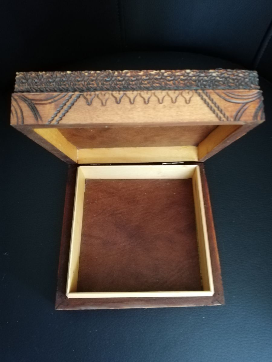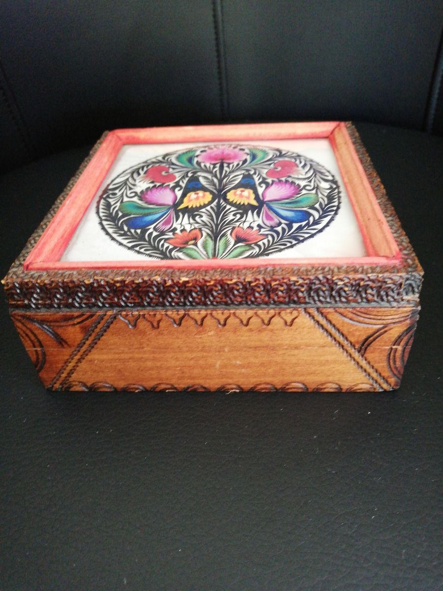 Petite boite en bois et couvercle avec dessin sous verre. 247gr