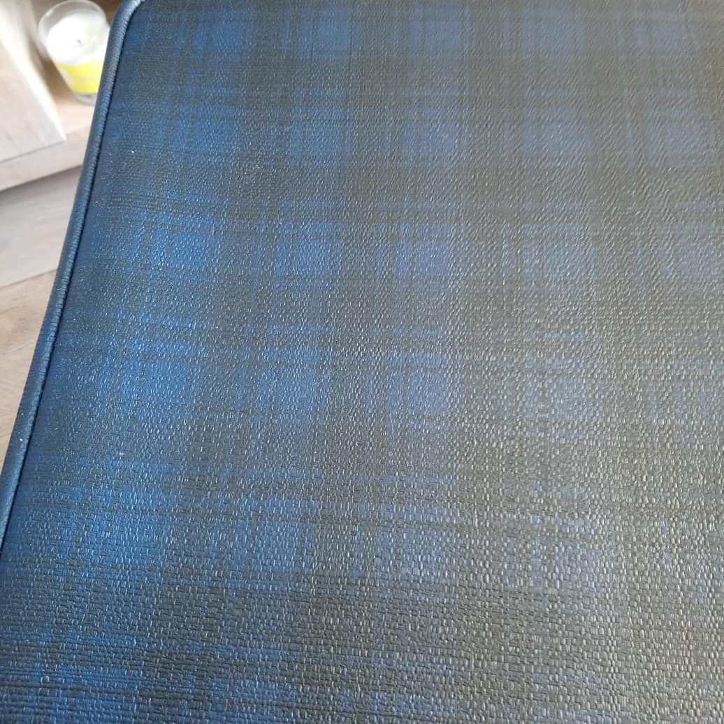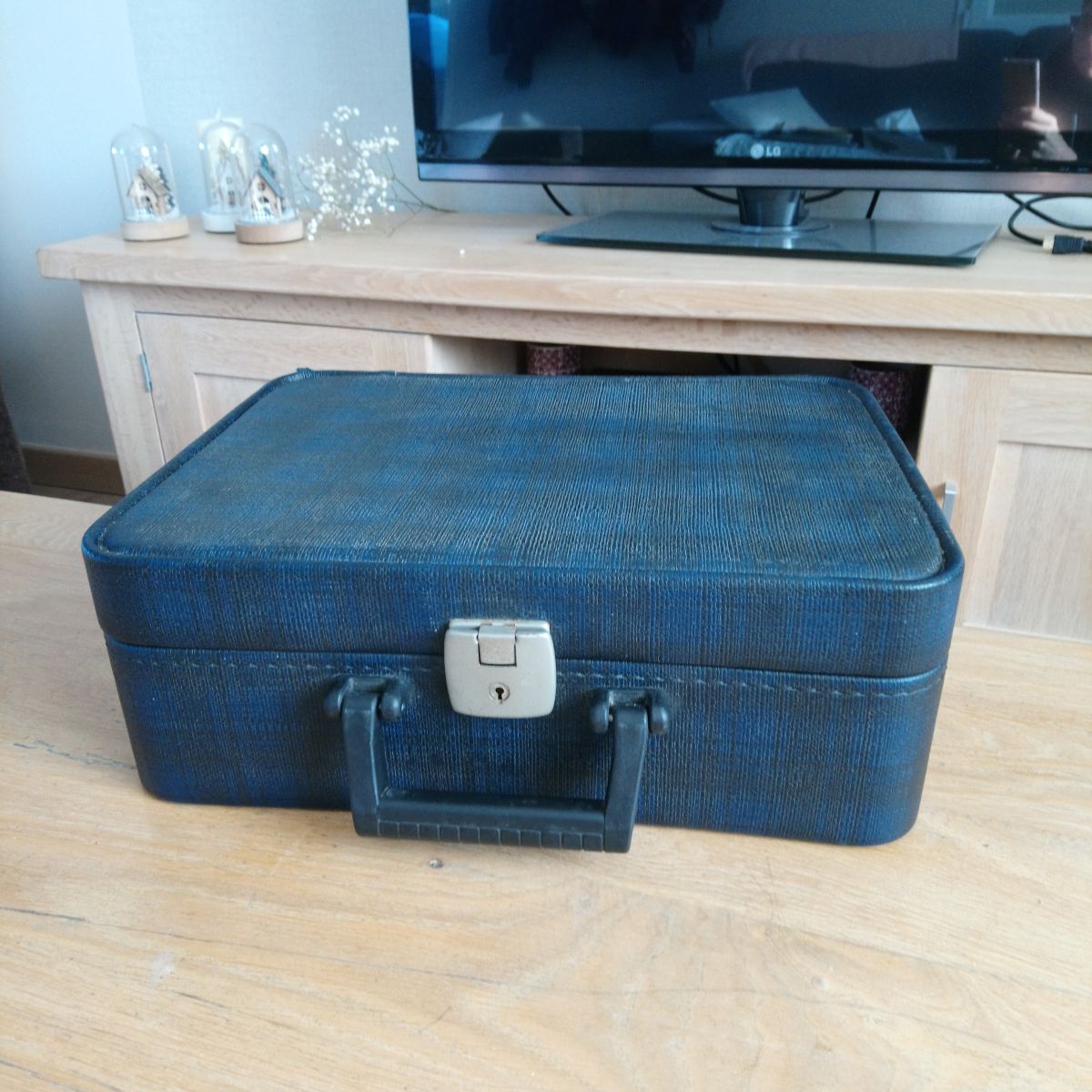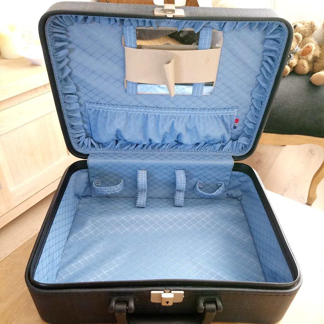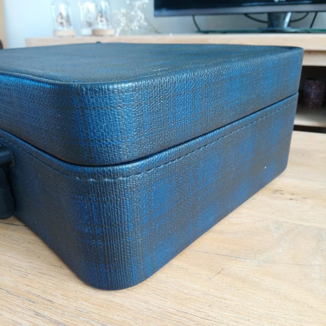 Jolie valise écossaise, bleu et noir. Fabrication française. Très peu utilisée, encore l'emballage autour du miroir.