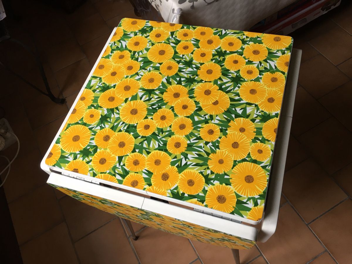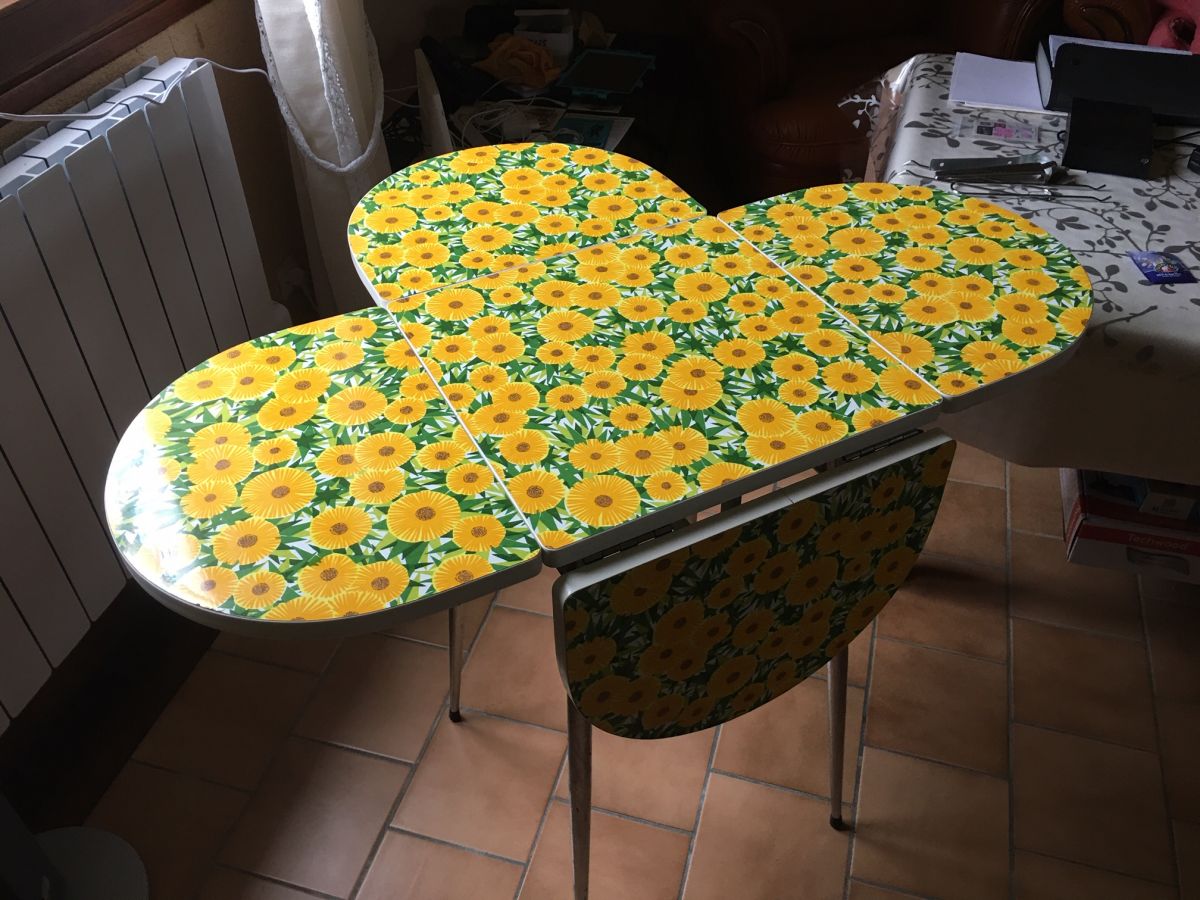 Table très original. Une plongée immédiate dans les années 1960, décor fleur jaune, formica, forme ... tout y est pour les amoureux du vintage authentique. Plus de 50 ans, mais tellement actuel pour trouver sa place dans un studio. La forme de base de la table est un carré de 40 cm x 40 cm avec quatre abattants arrondis de chacun 29,5 cm pour une hauteur de 74 cm. Une fois dépliés, les abattant donne à la table une forme de fleur, d'1 m x 1 m. Idéal pour accueillir quatre convives.