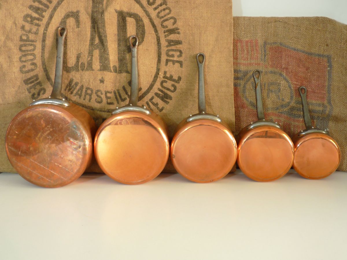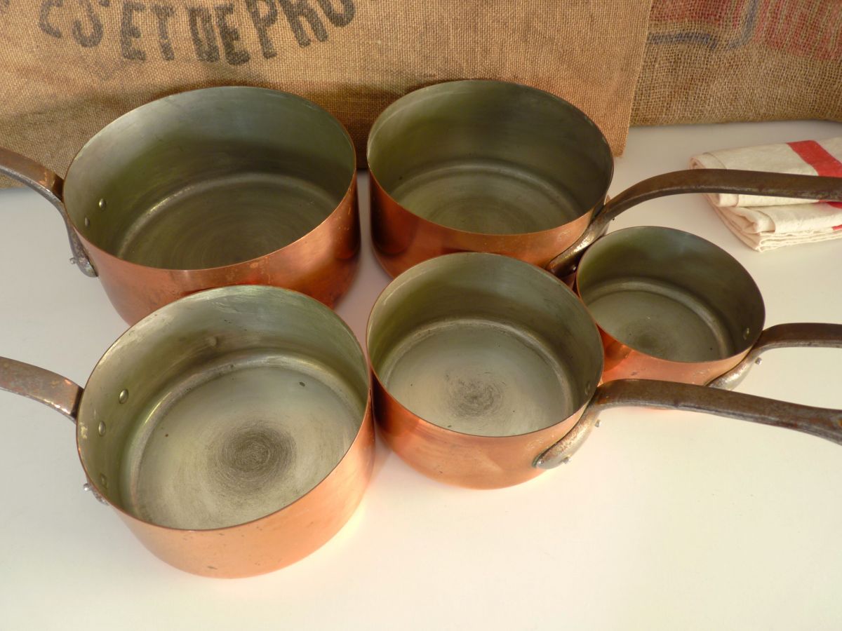 Lot de 5 casseroles française en cuivre massif étamé avec poignée en laiton
