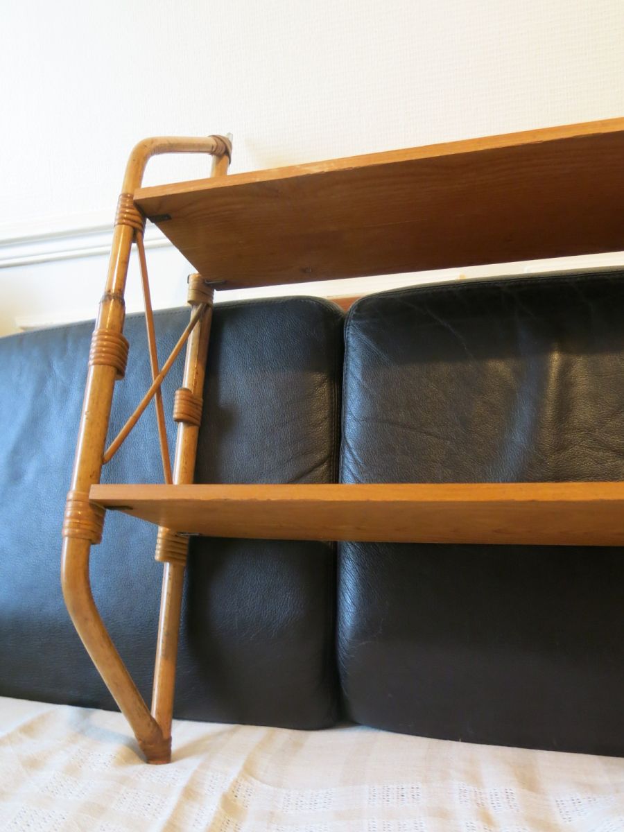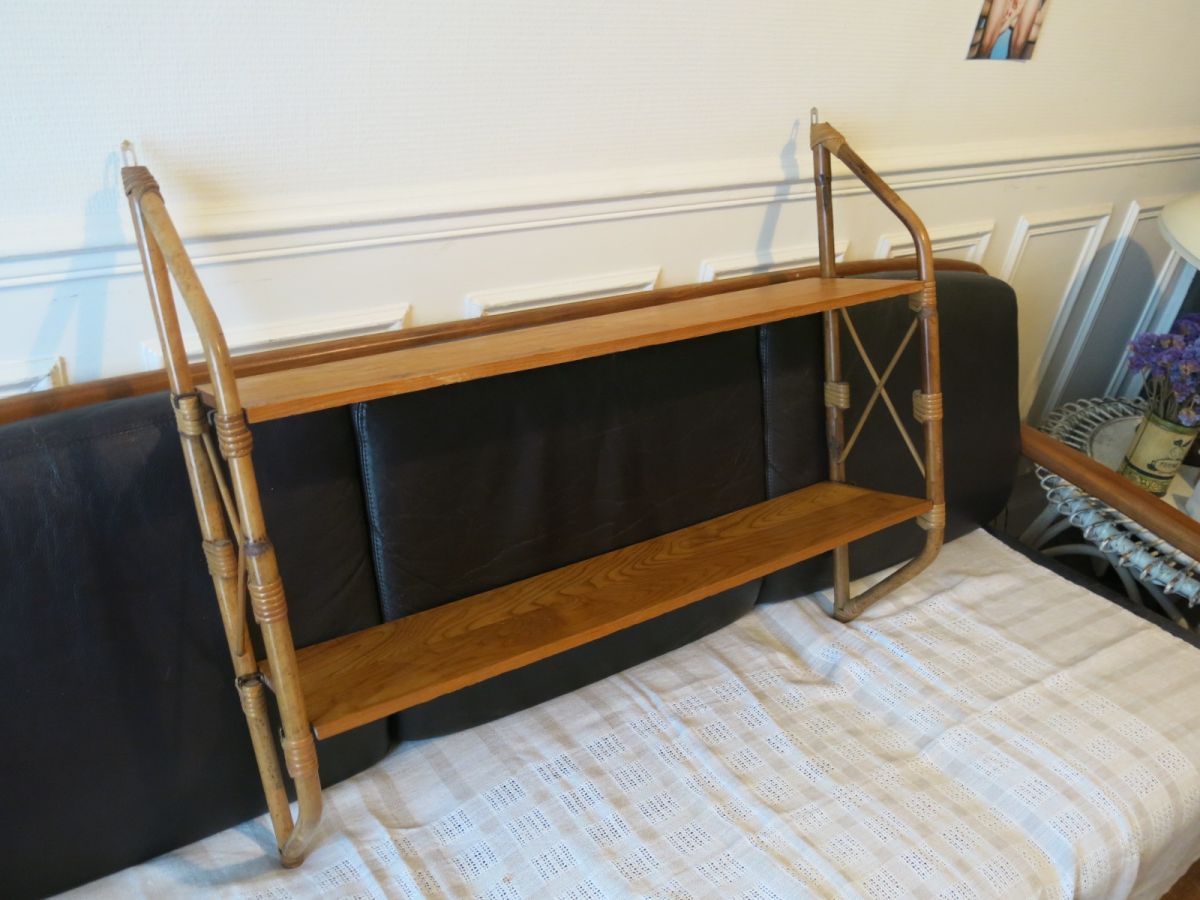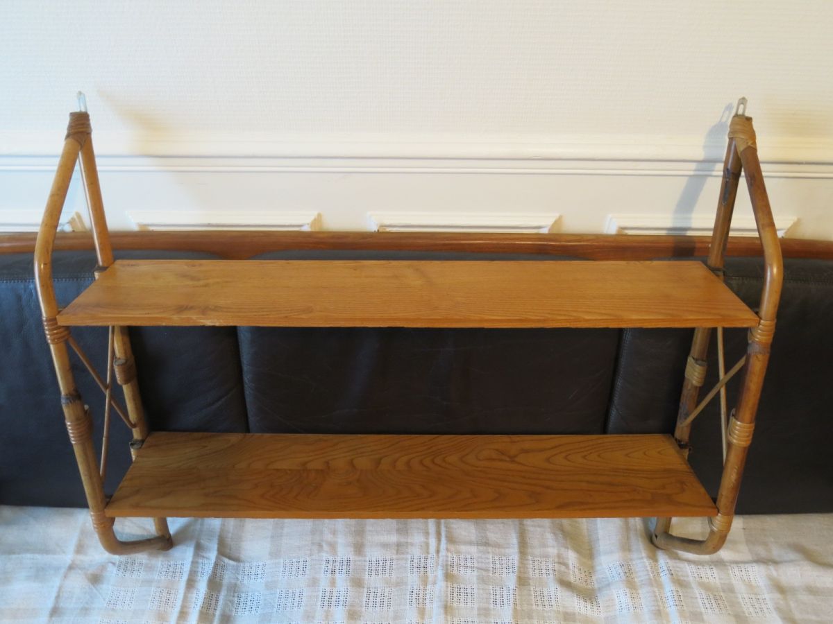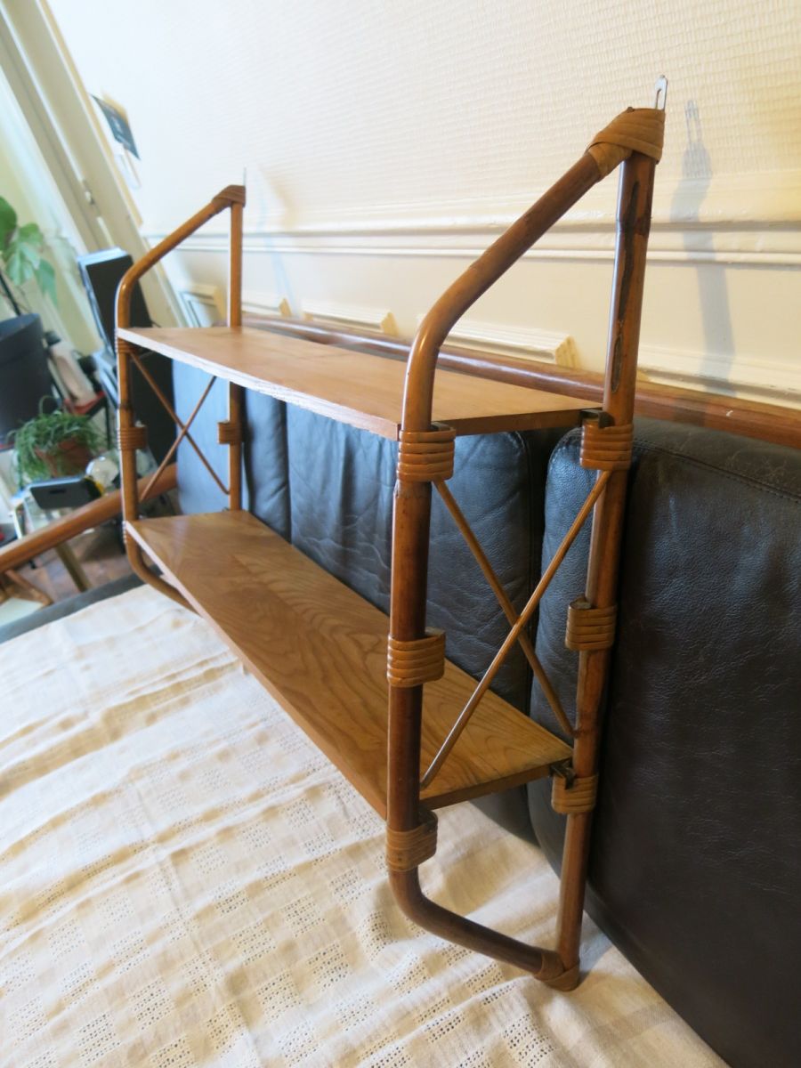 Grande étagère murale double modulable rotin & bois 50s 60s