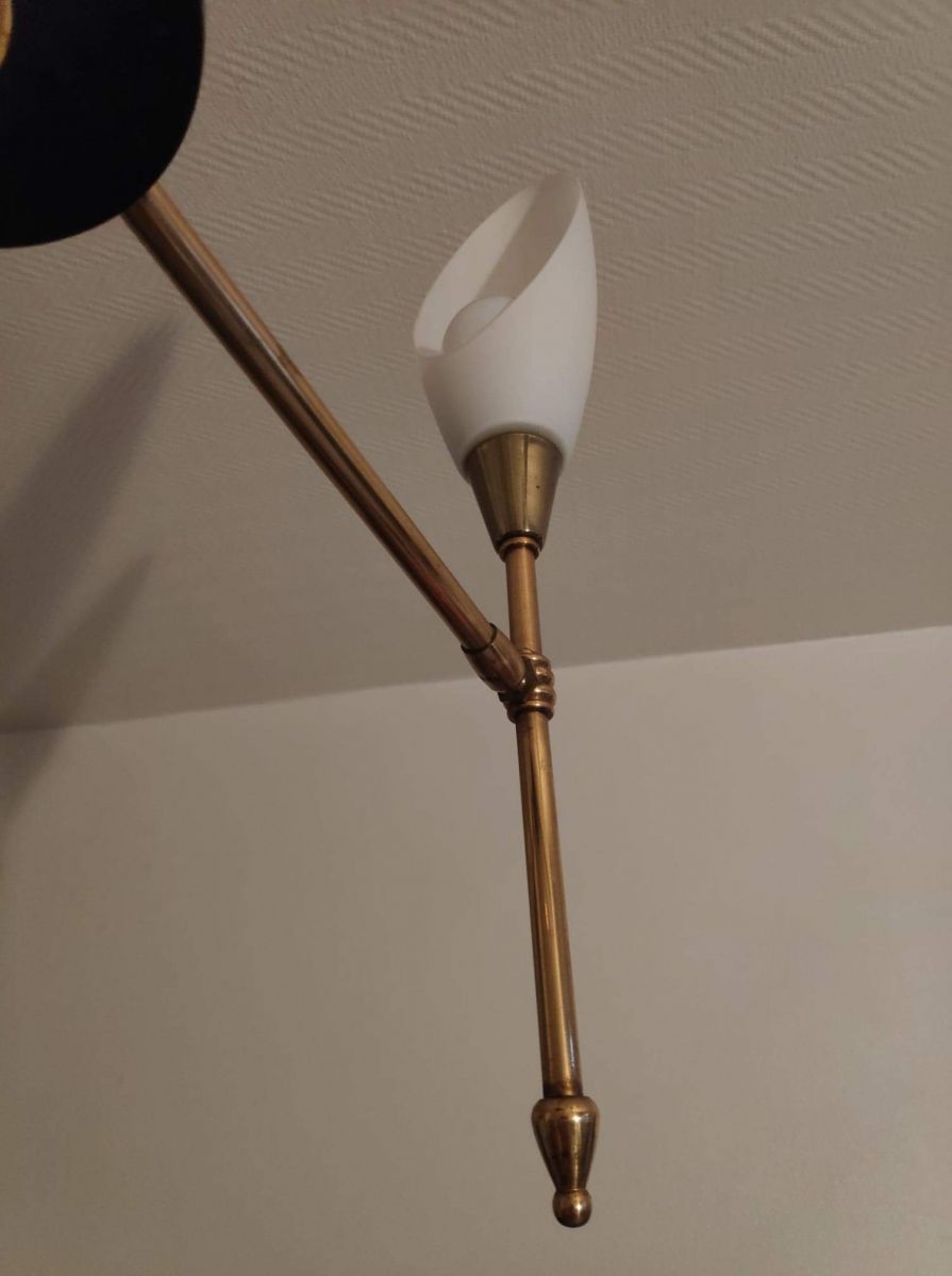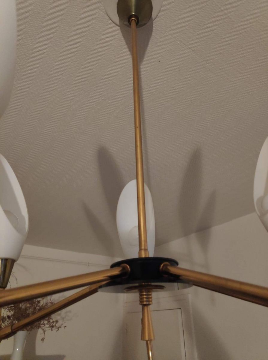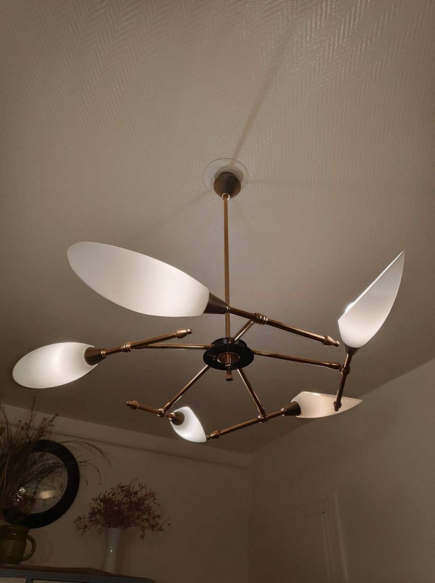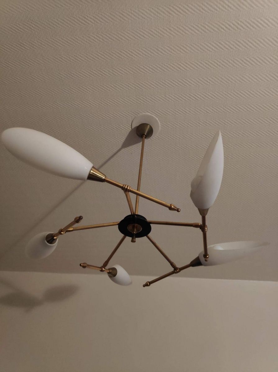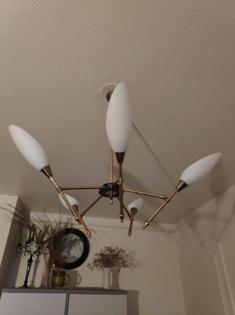 lustre vintage des années 50 Arlus Lunel avec 5 tulipes opaline directionnelles inclinables et orientables.