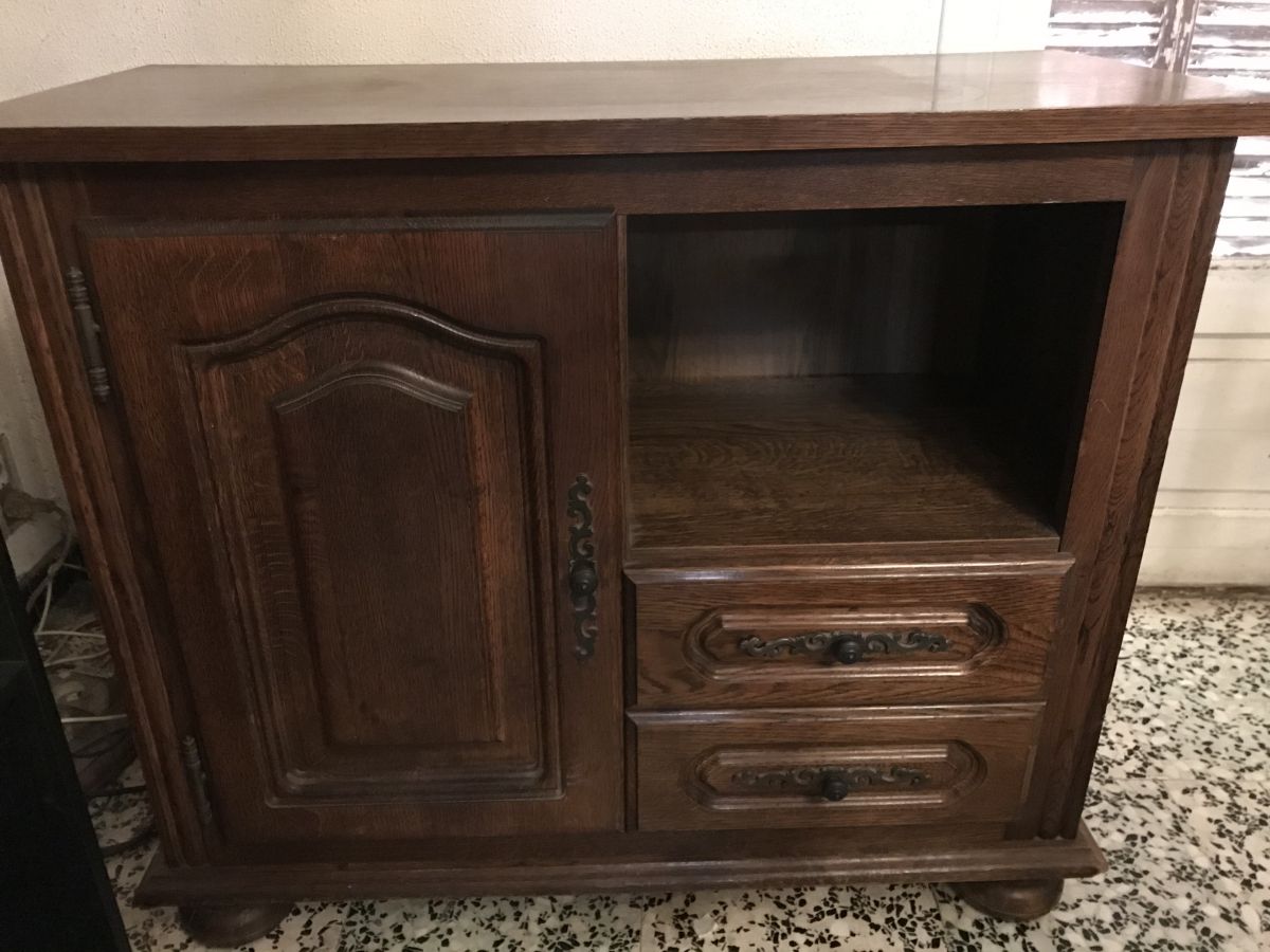 Meuble tv avec rangement avec portes et 2 étagères ainsi que 2 tiroirs.