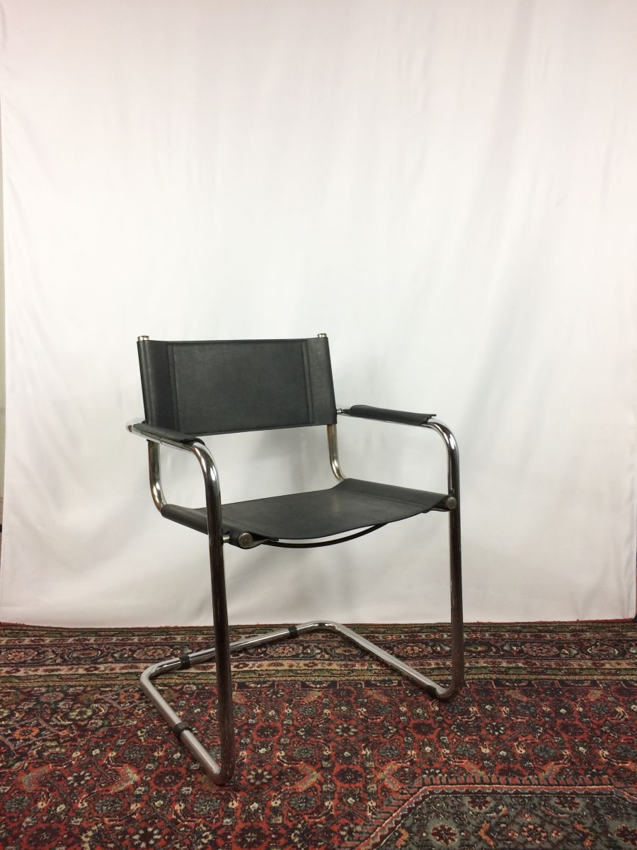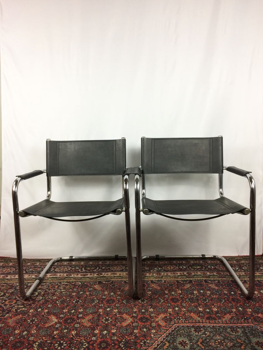 Paire de fauteuils esprit "modèle Cantilever S34" de Mart Stam en simili cuir noir, en bon état.