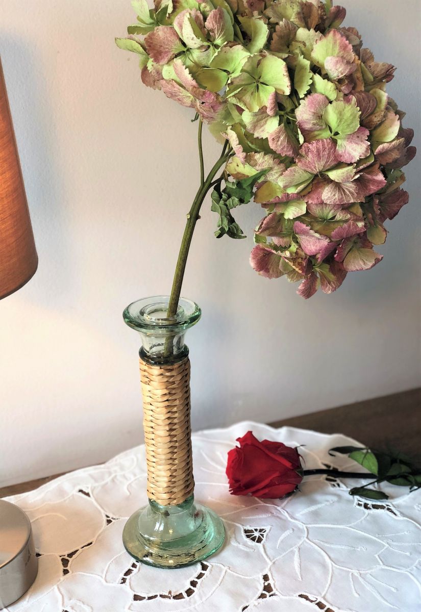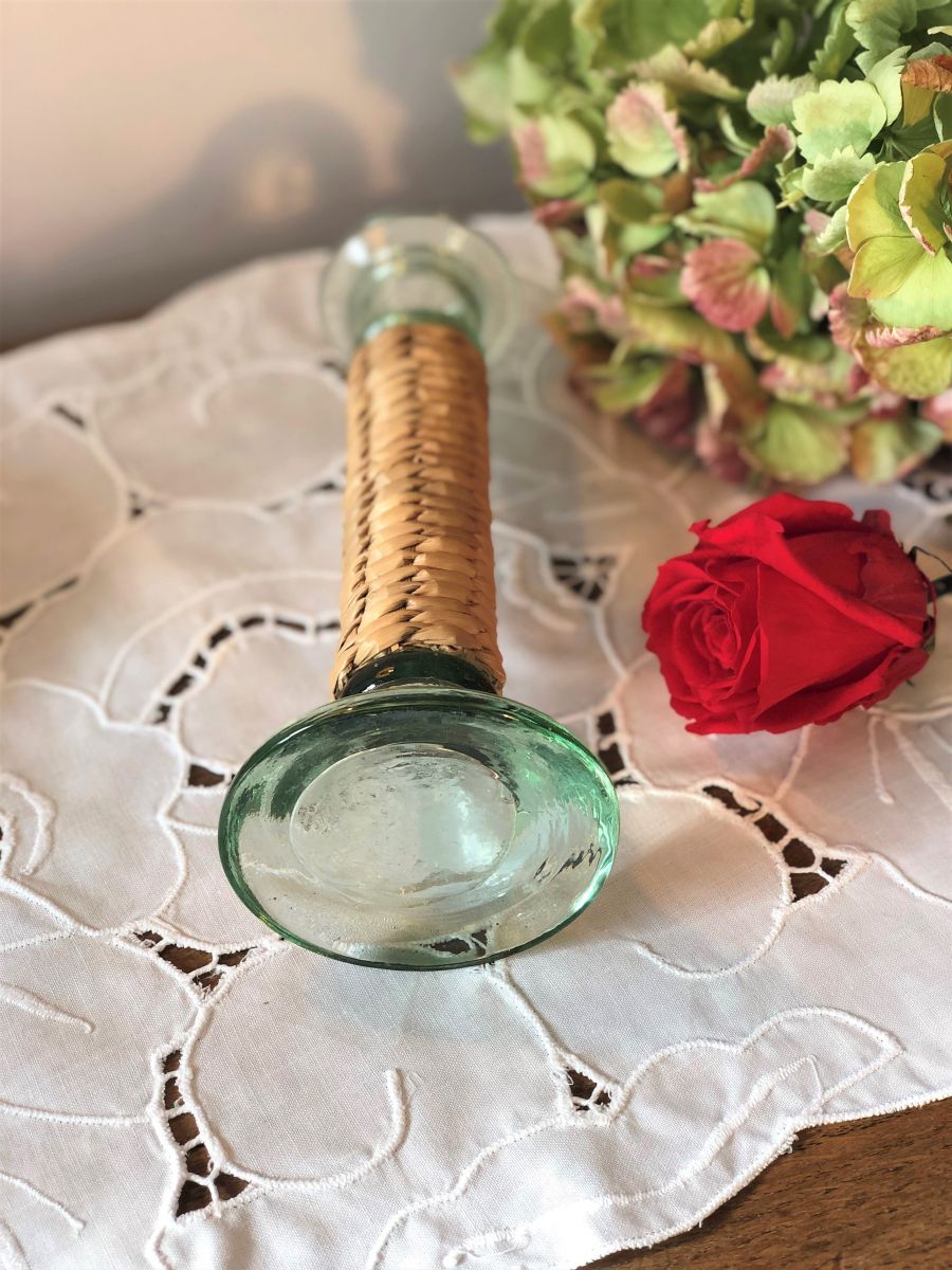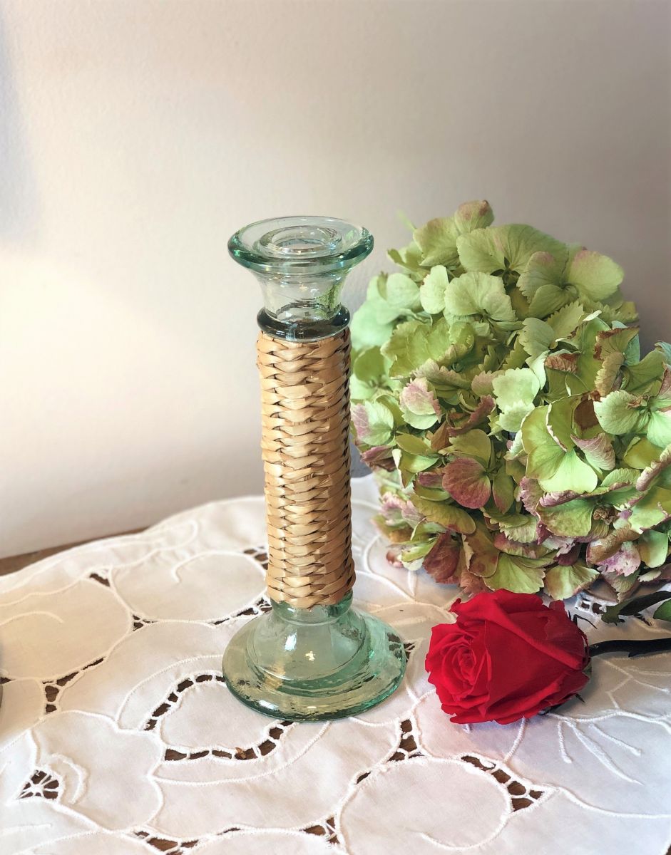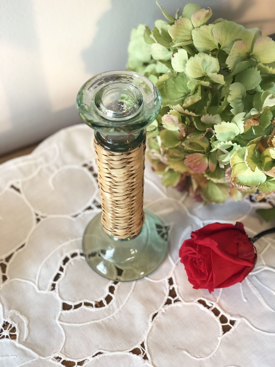 Ravissant bougeoir, chandelier en verre et osier paille - Vintage.