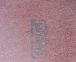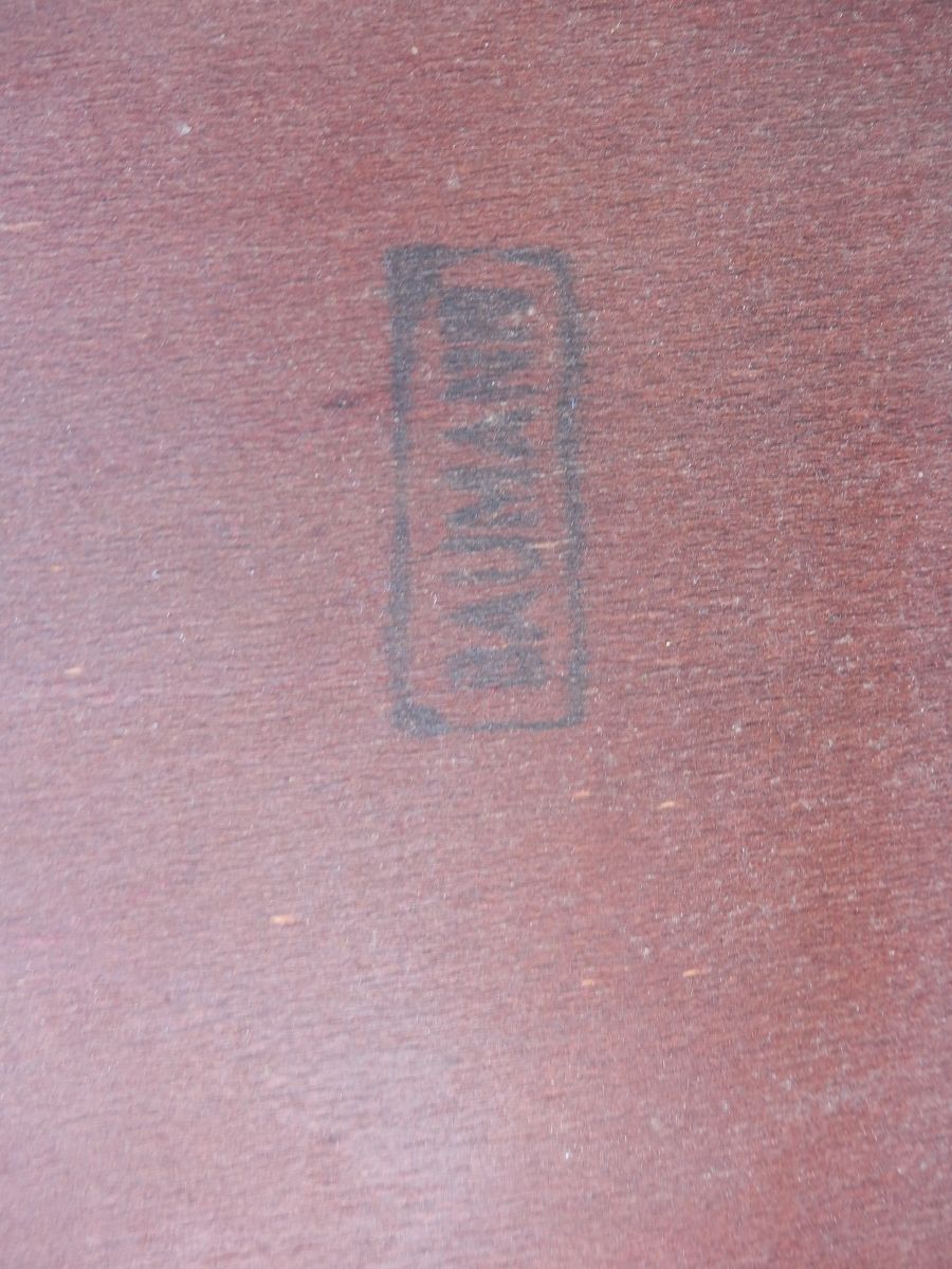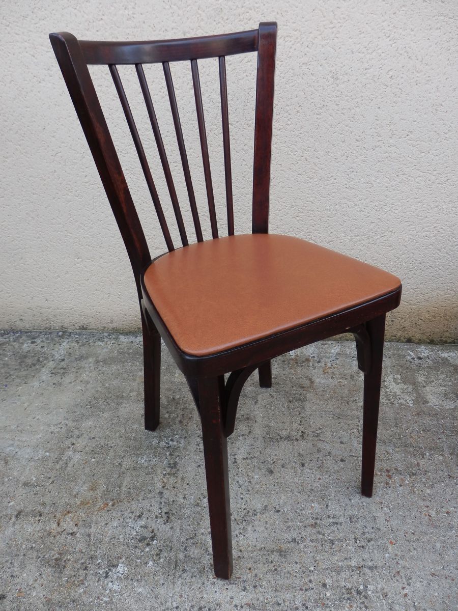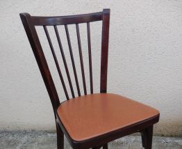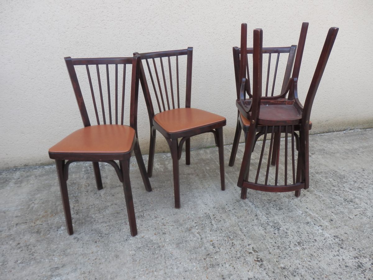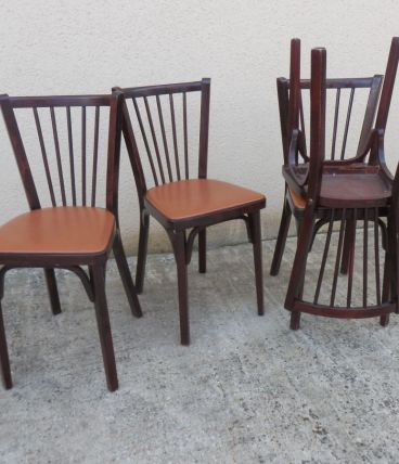 Série de 4 chaises Baumann à barreaux, assise en skai marron, bois vernis teinte foncé (état d'origine), très bon état.