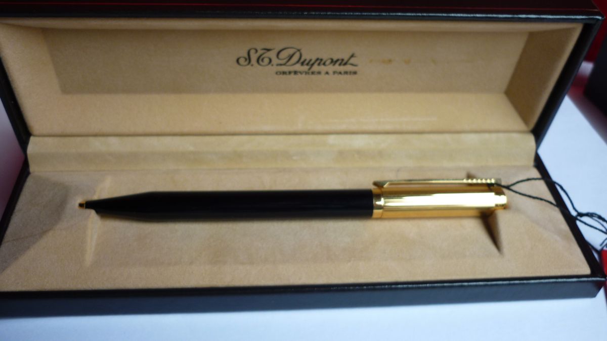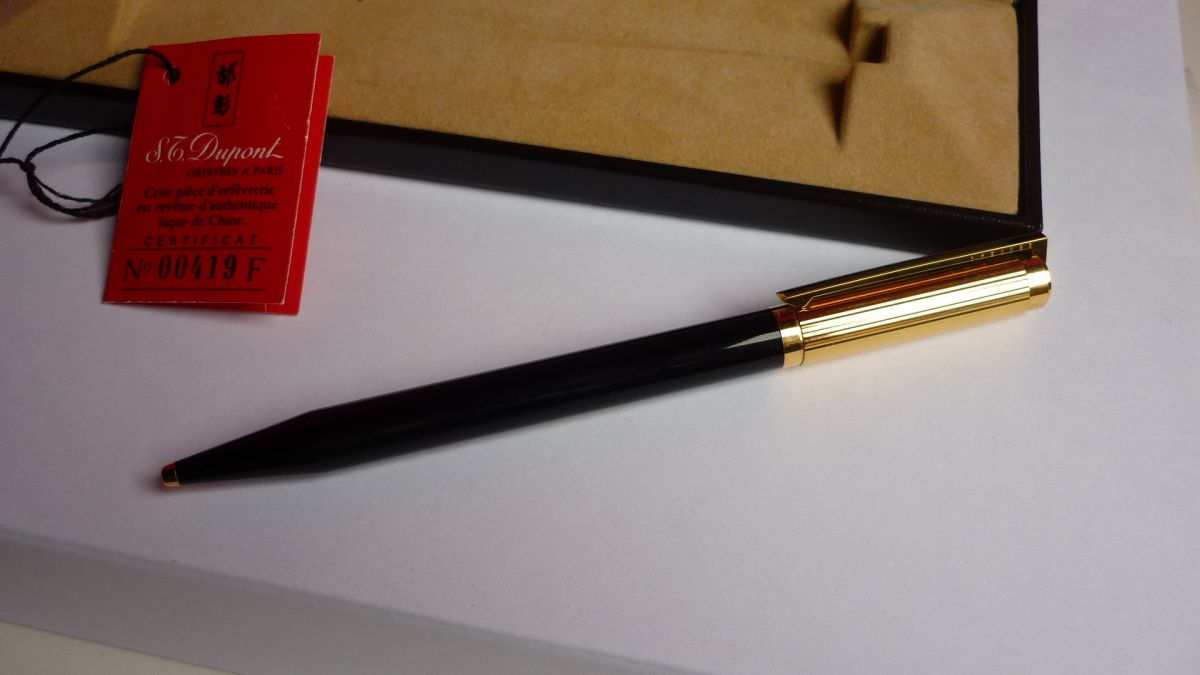 Stylo bille de la célèbre marque DUPONT en laque de chine noire et plaqué or 24 carats.