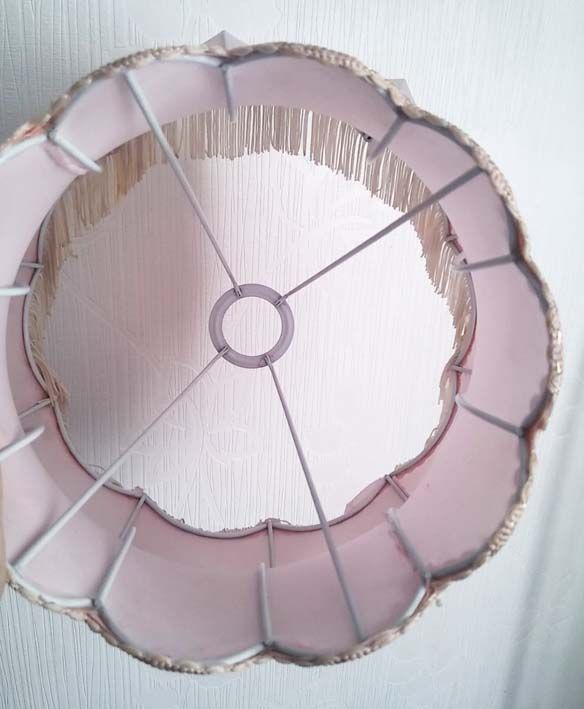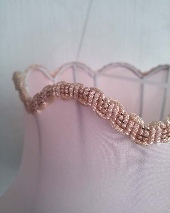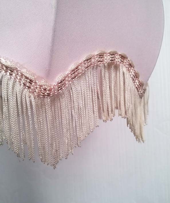 Abat-jour en tissu rose clair à franges forme tulipe et bordures recouvertes de galon rose et fil doré , armature blanche